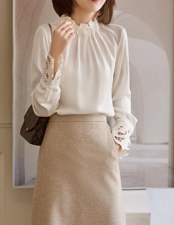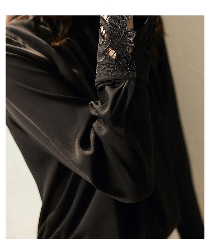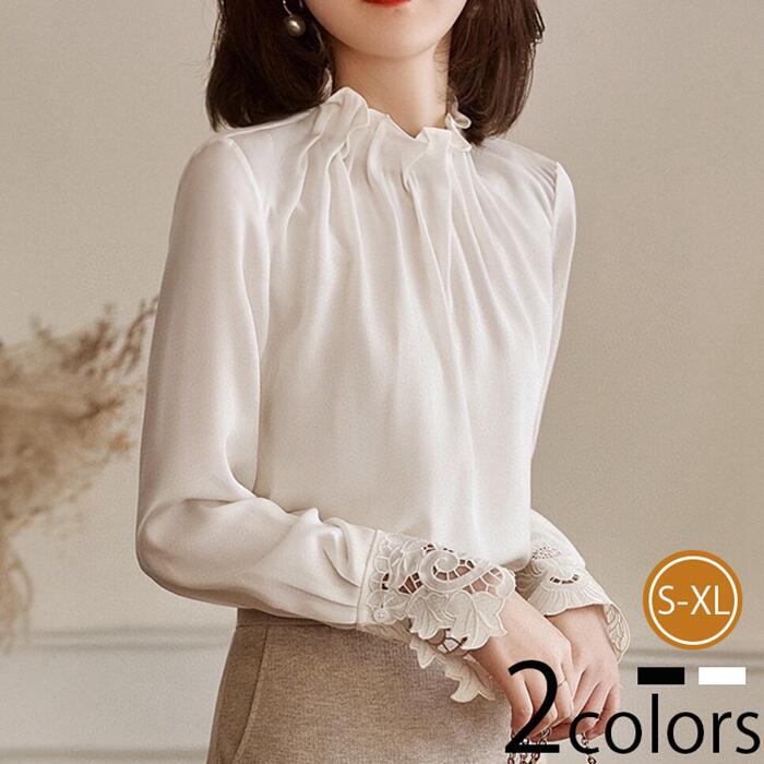 ブラウス フリル襟 レディース シャツ トップス 長袖 ハイネック レース袖 セレモニー フォーマル タック ギャザー 刺繍 キレイめ オフィス 春 夏 大人可愛い 通勤 おし 秋