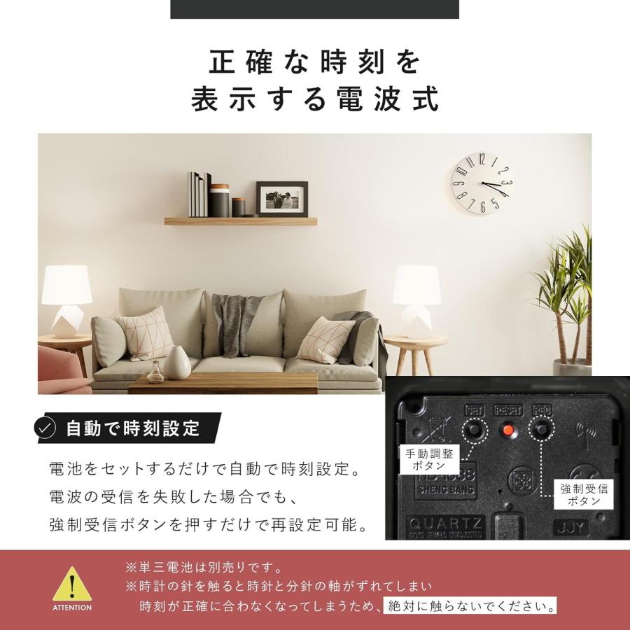 【自動で正確な時刻をお知らせ】:電池をセットするだけで、自動的に正確な時刻が設定されます電波の受信を失敗した場合でも、強制受信ボタンを押すだけで再設定が可能です。※時計の針を触ると時針と分針の軸がズレてしまい、時刻が正確に合わなくなってしまうため、絶対に触らないでください。