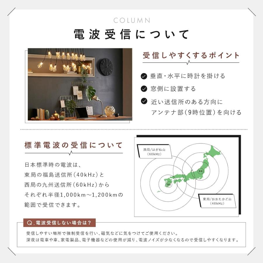 【電波受信方法】:電波ノイズを発生させる機器などの近くでのご使用は避け、電波を受信しやすい窓際などに設置してください。 地図を参考に、近い送信所のある方向にアンテナ部(9時位置)を向けるとより良い受信環境になります。 深夜は電車や車、家電製品、電子機器などの使用が減り、電波ノイズが少なくなるので受信しやすくなります。