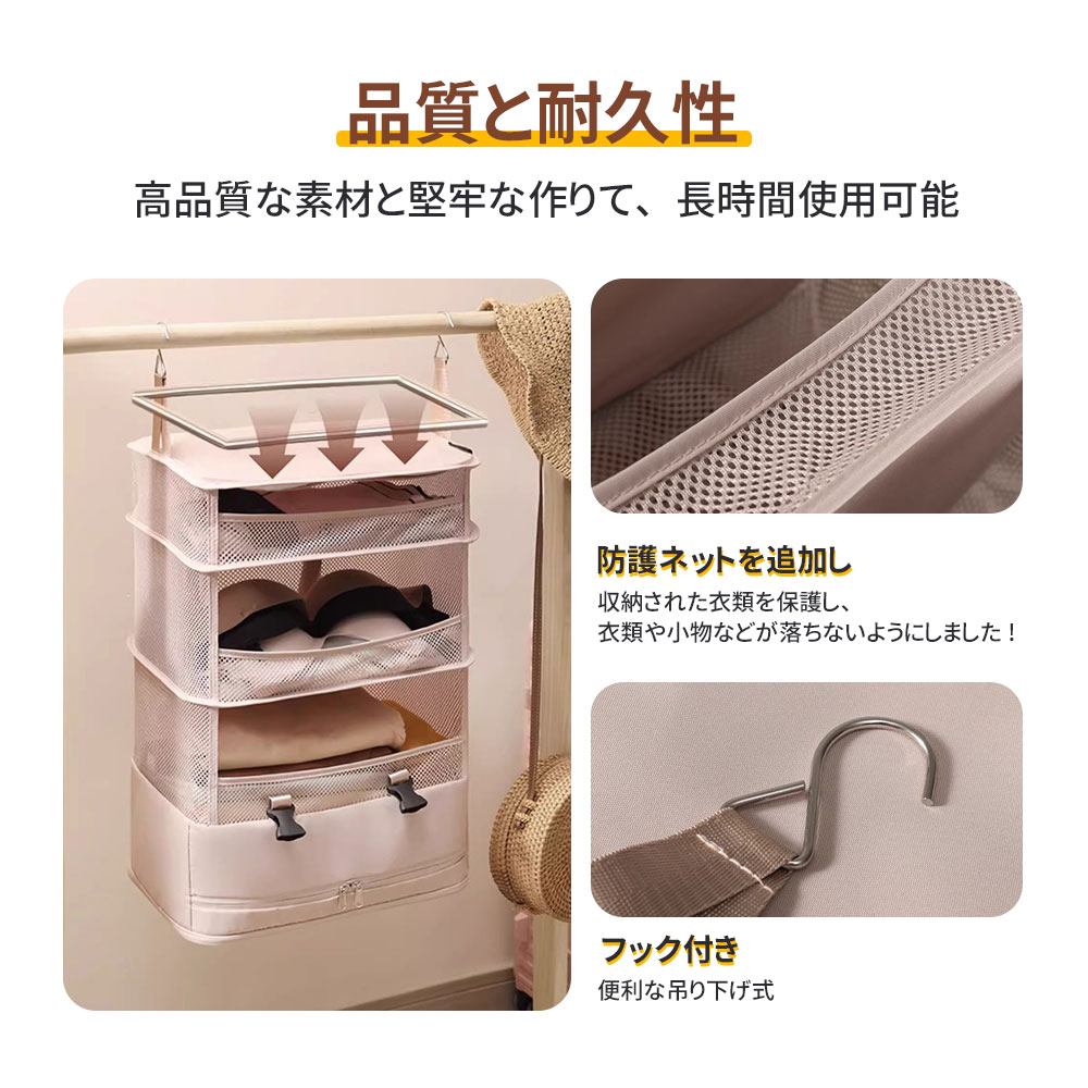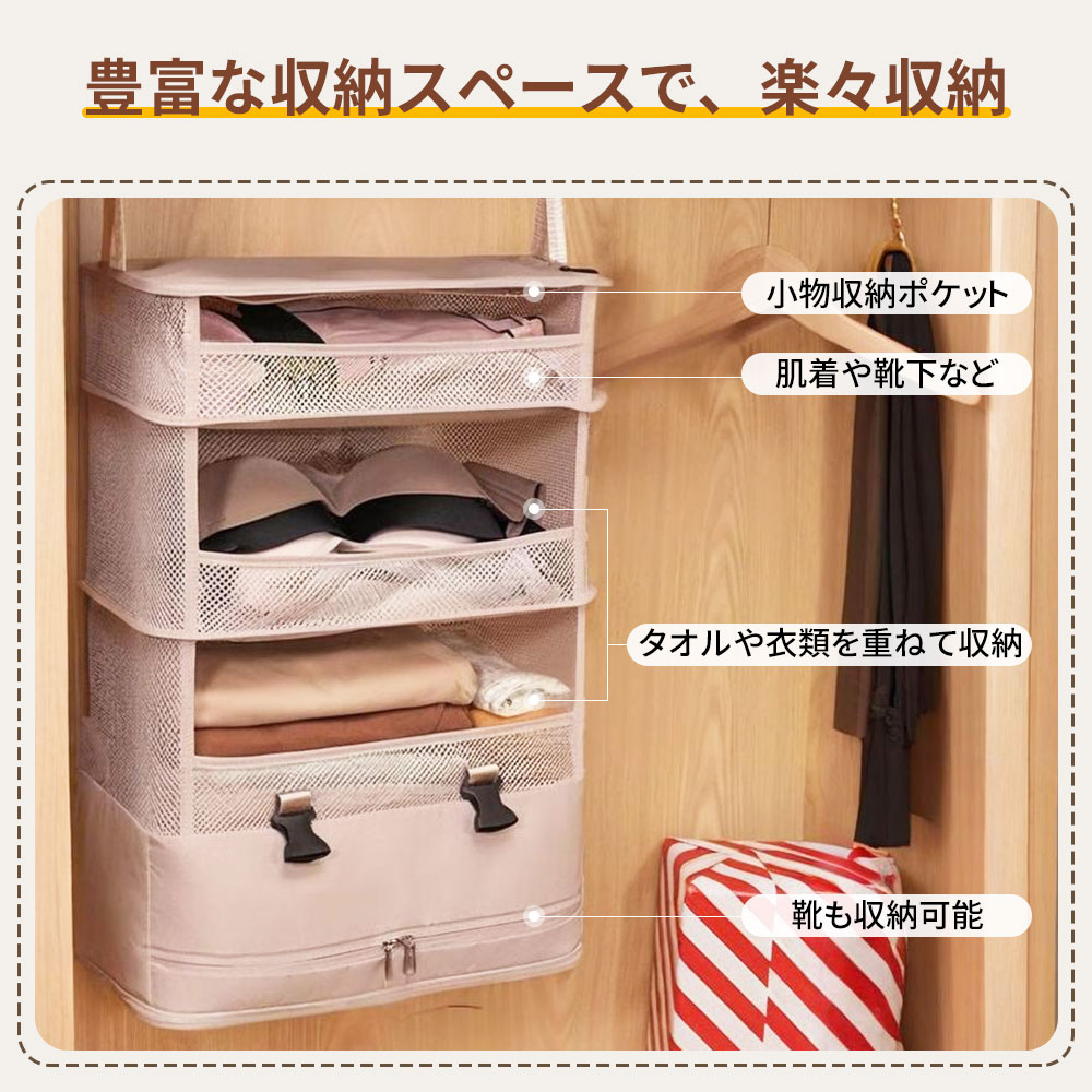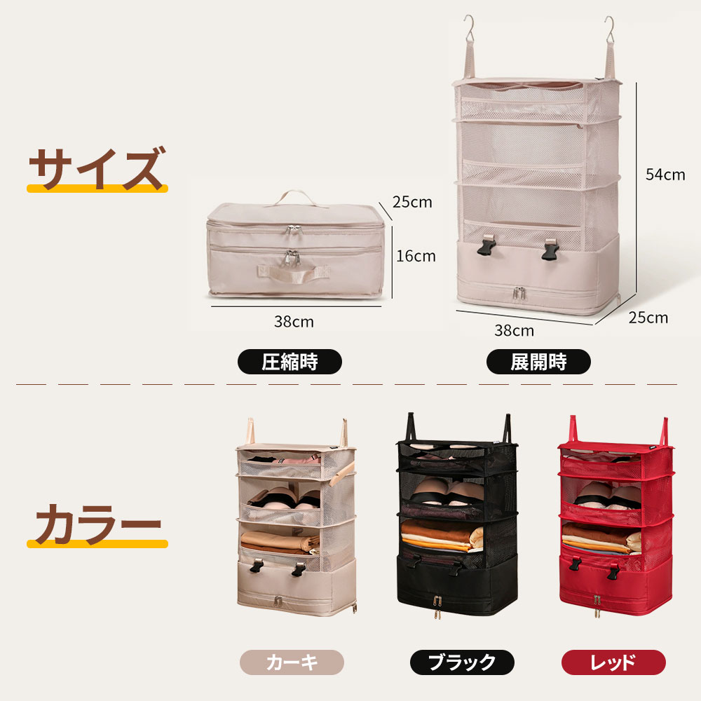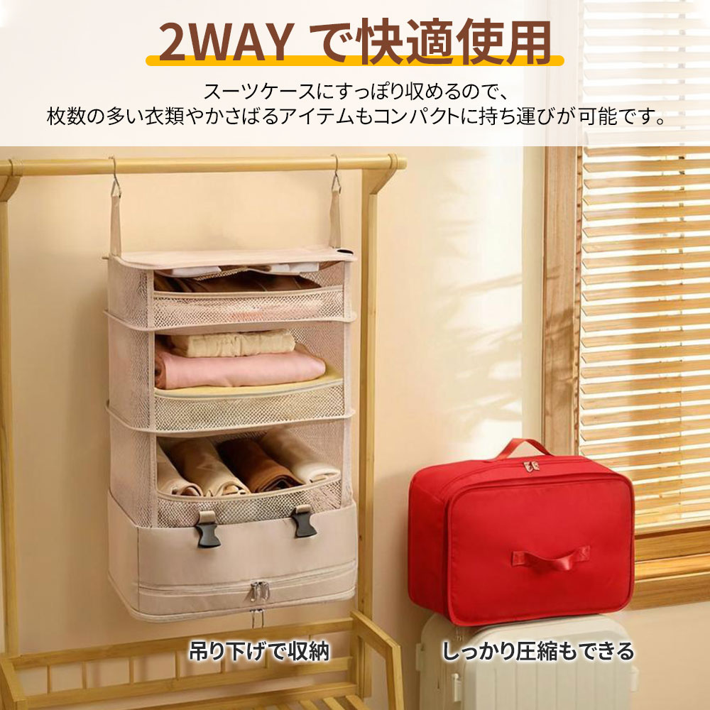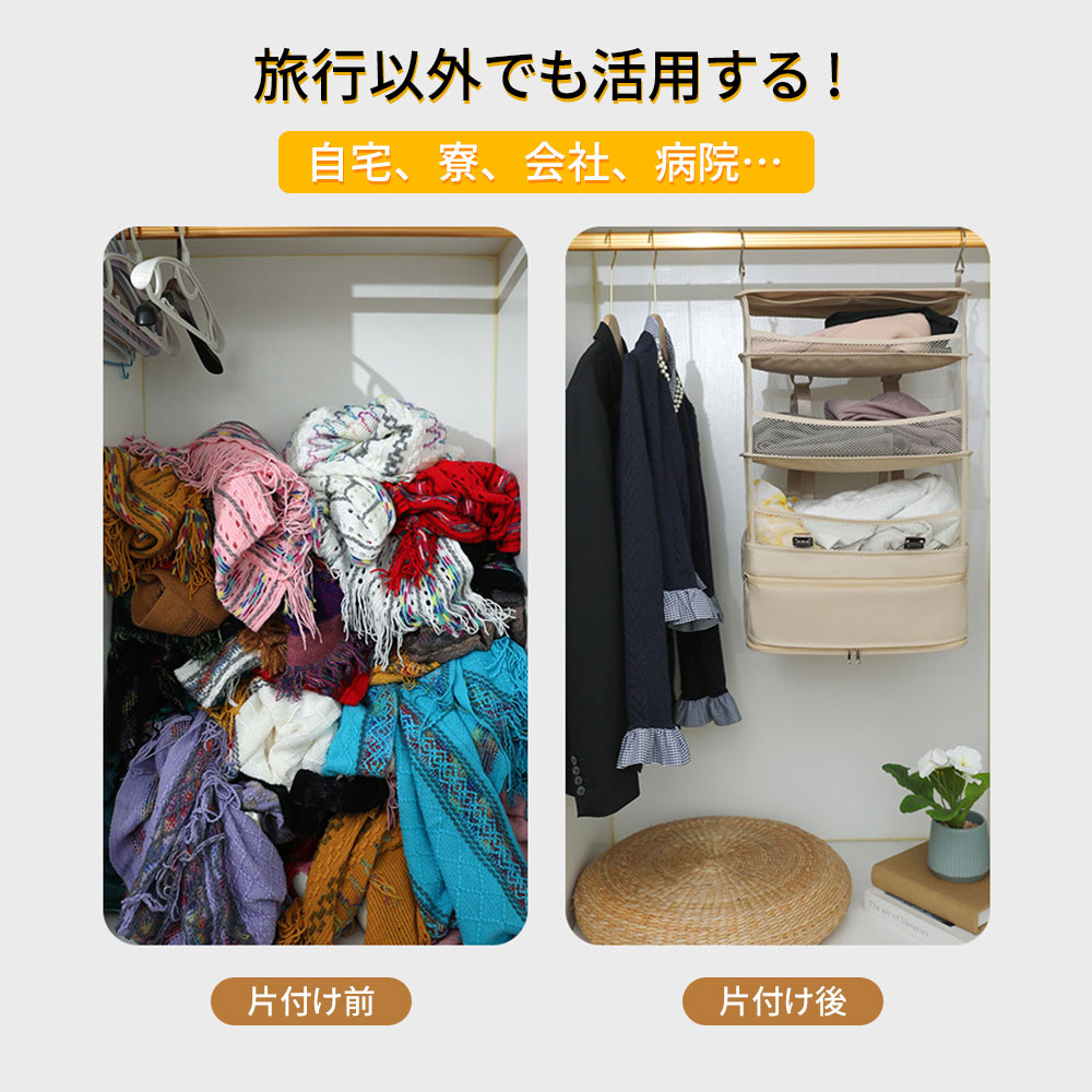 様々な場所や状況に応じて柔軟に対応できるデザイン。衣類の整理がラクになり、旅がもっと楽しくなります。