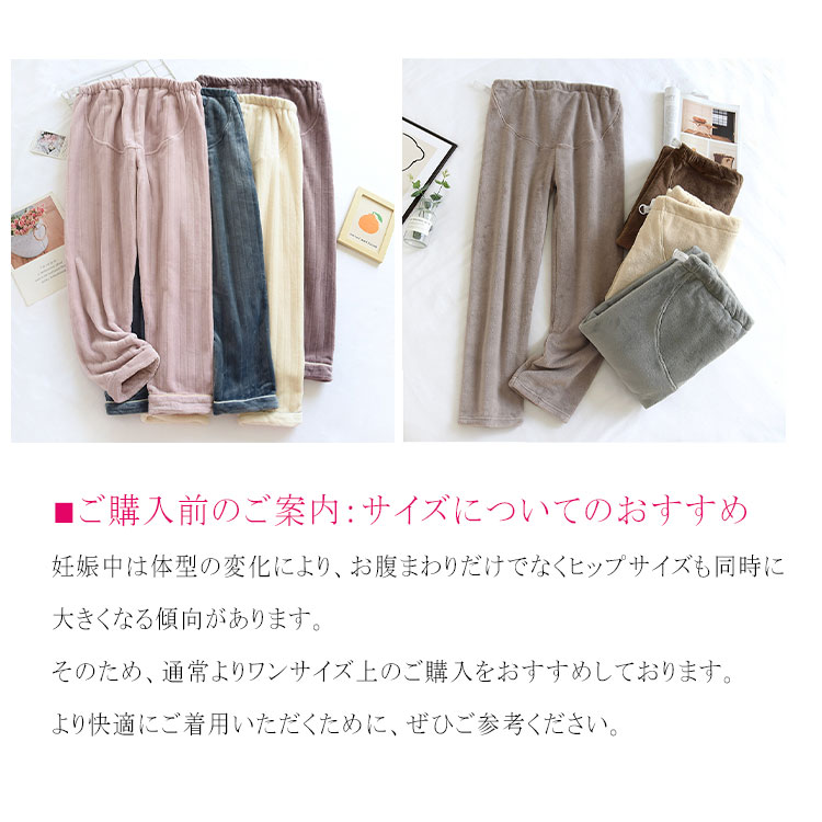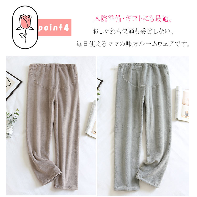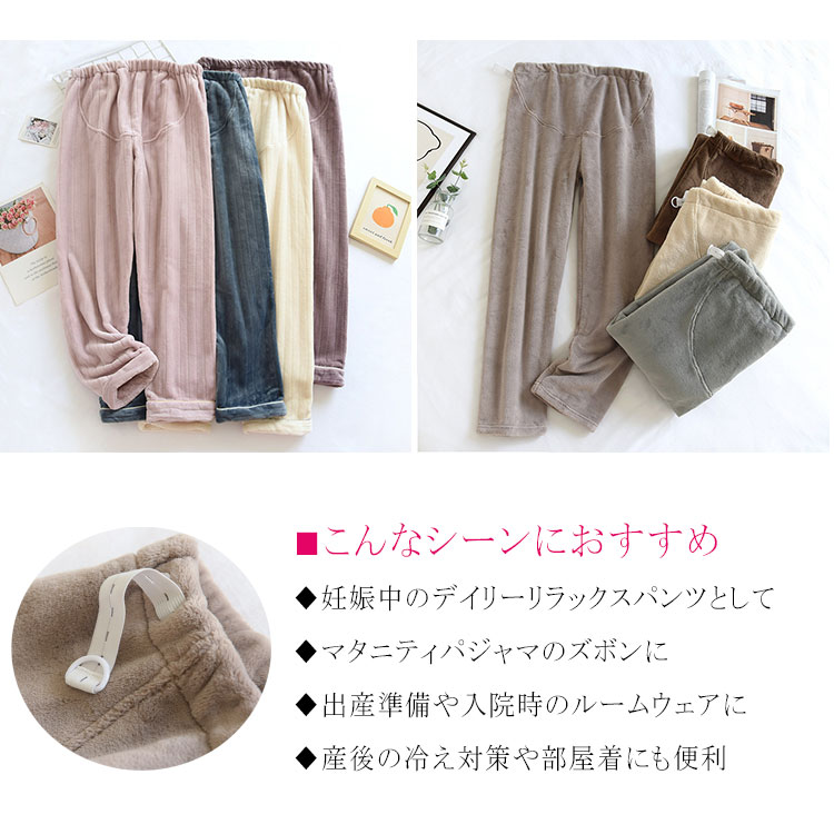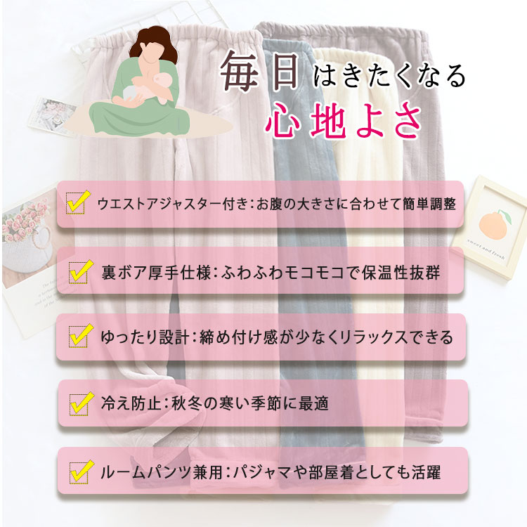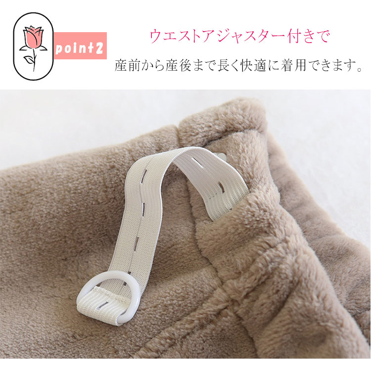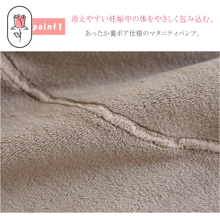 冷えやすい妊娠中の体をやさしく包み込む、あったか裏ボア仕様のマタニティパンツ。ウエストアジャスター付きで産前から産後まで長く快適に着用できます。