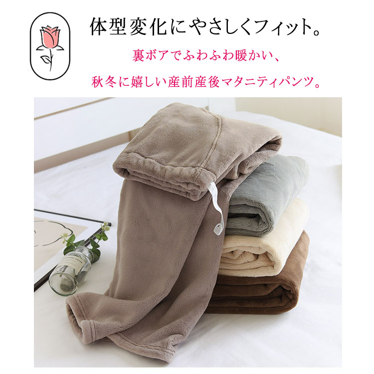 体型変化にやさしくフィット。裏ボアでふわふわ暖かい、秋冬に嬉しい産前産後マタニティパンツ。