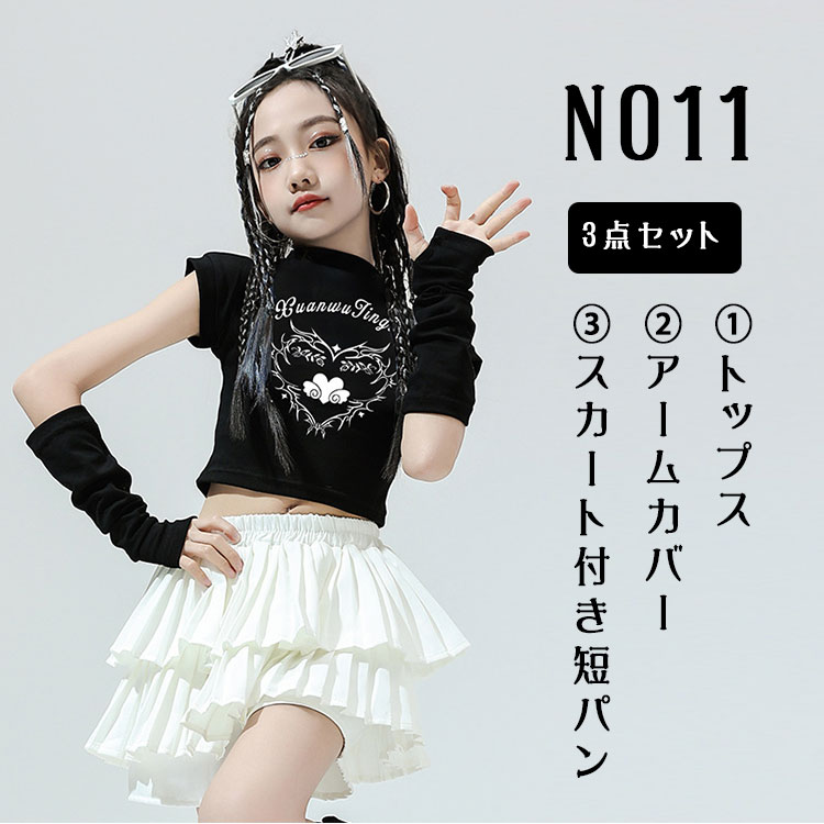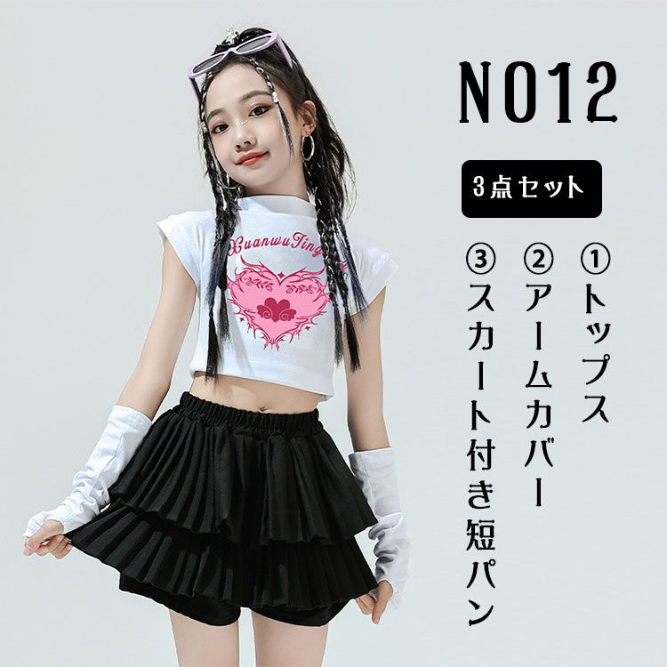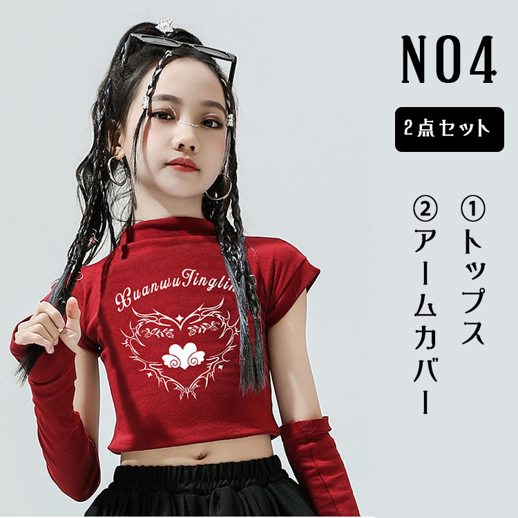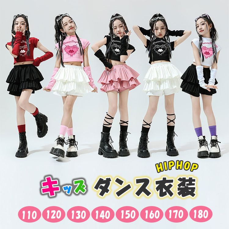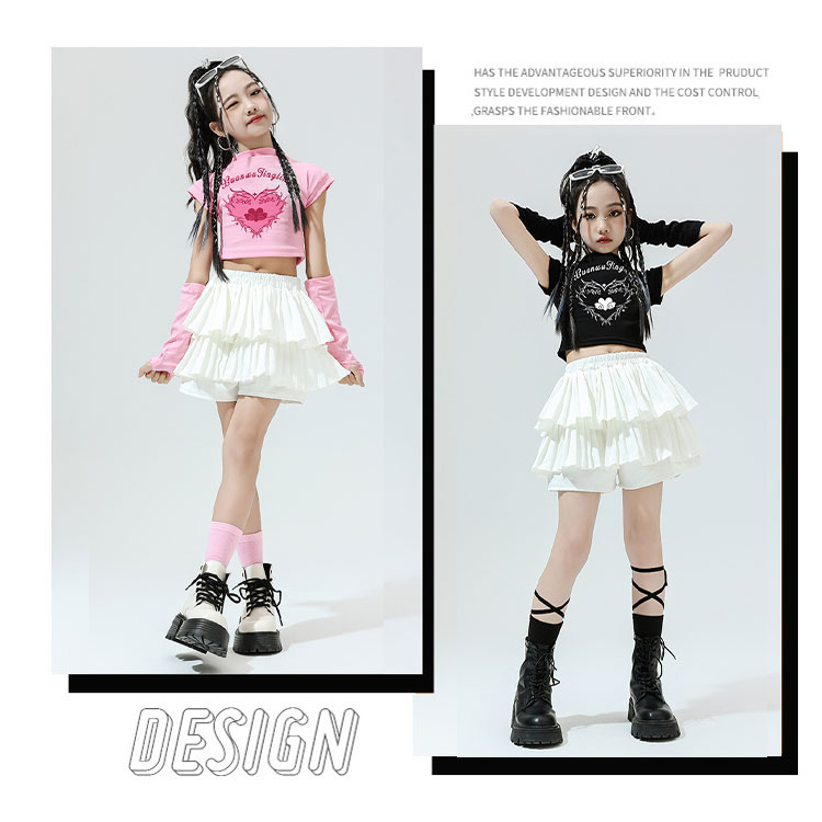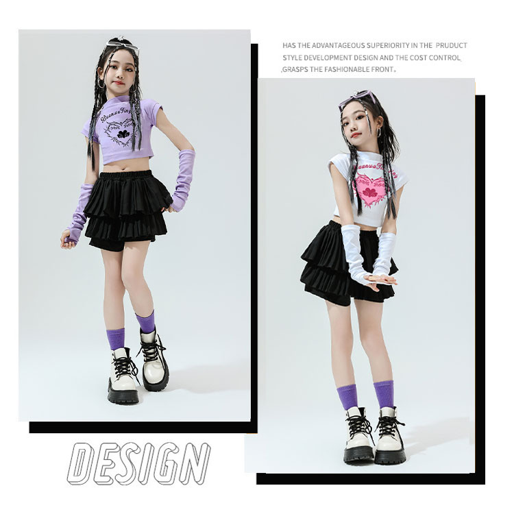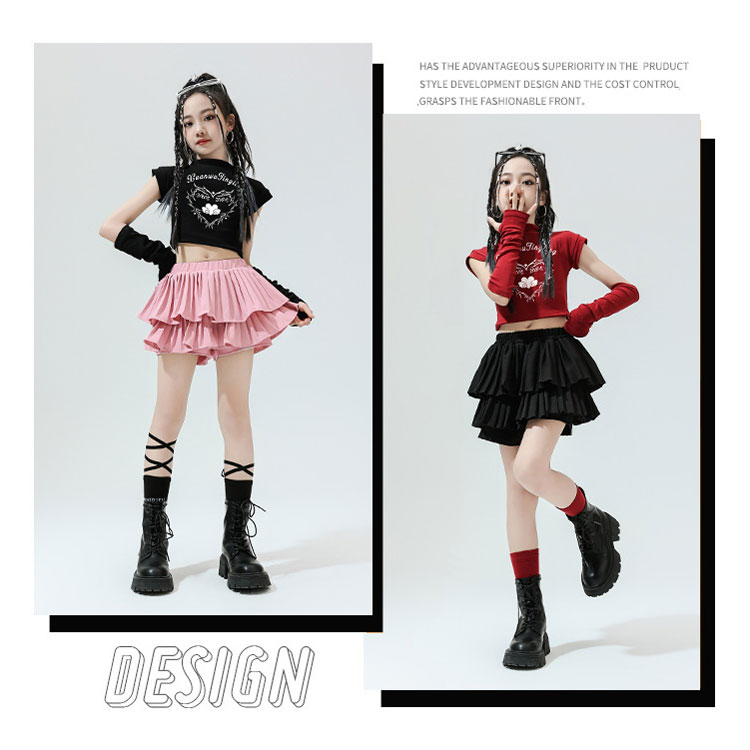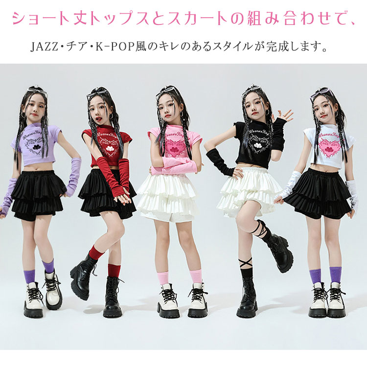 キッズ ダンス衣装 セットアップ 女の子 JAZZ チア チアガール K-POP 韓国風 ヒップホップ ショート丈 Tシャツ へそ出し トップス ダンススカート アームカバー付き 単品販売 スカート