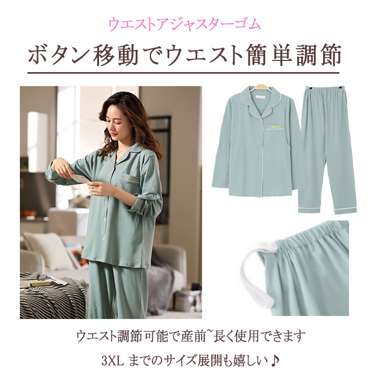 マタニティパジャマ 授乳パジャマ 長袖 長ズボン 上下2点セット M L XL XXL 大きいサイズ 両脇授乳口 ウエストアジャスターで調節 綿 秋 冬 春 妊娠期 入院 産後 授乳期 出産祝 出産