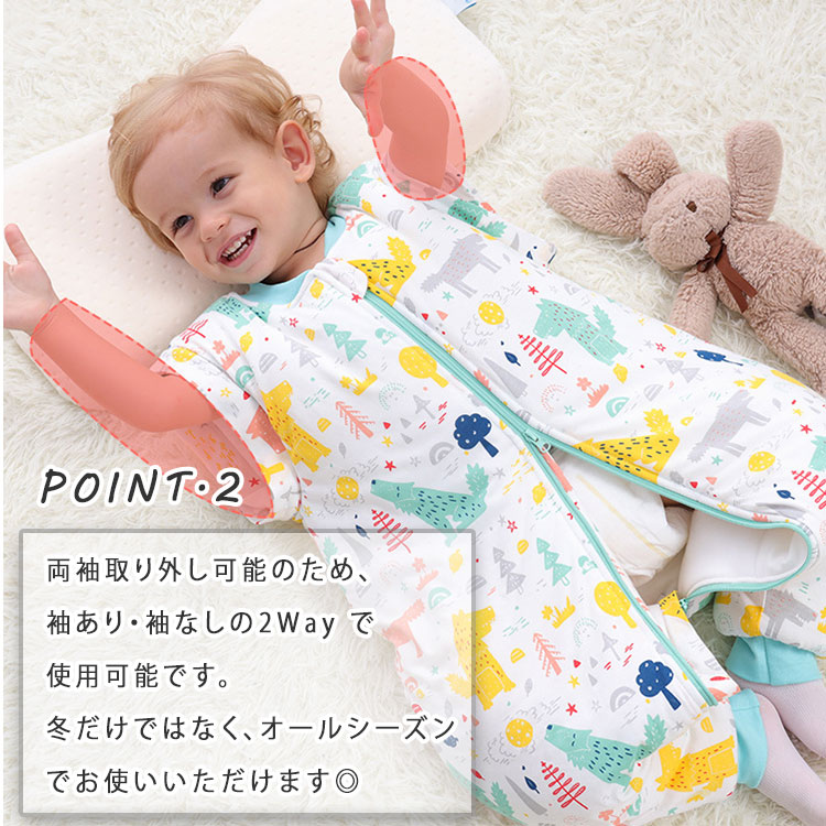 赤ちゃんスリーパー ベビー&キッズ用スリーピングバッグ 0歳~6歳 柔らか厚手 秋冬 防寒 暖か寝袋 着脱可能袖(長袖/半袖)上下双方向開閉可能ファスナー オムツ交換/温度調節が便利 足元ゆったり