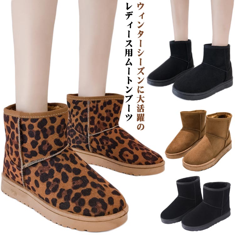 シンプル ムートンブーツ フラットソール ショート丈 ヒョウ柄 スエード調 デイリー 厚底 無地 単色 レディース 婦人用 防寒 暖かい ふわふわ 裏ボア かわいい ショートブーツ 普段使い おしゃれ