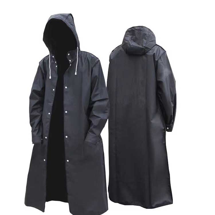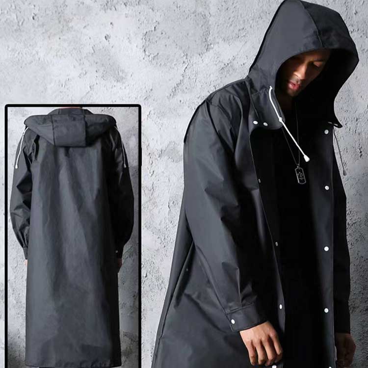 膝下までカバーするロング丈、体がしっかり覆われ、レインブーツを履けば足元まで濡れにくく、全身を雨から守ることができます。