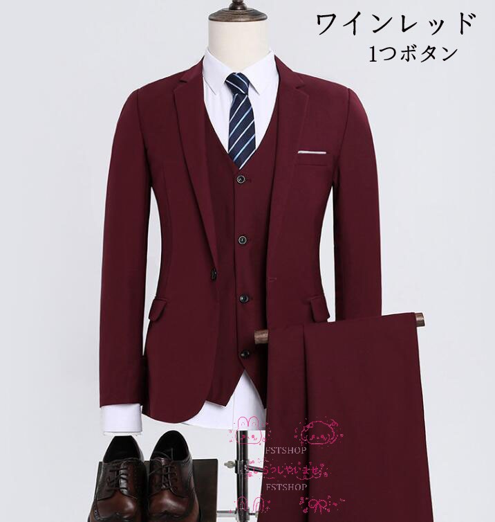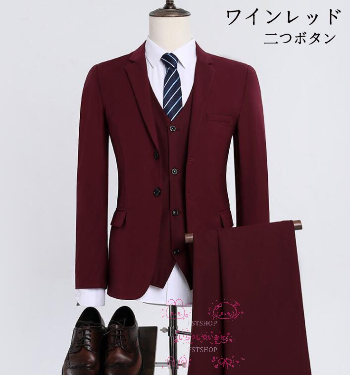 メンズ フォーマルスーツ男性用スーツ3点セット礼服セットアップ通勤ジャケット+ズボン+シャツ ベスト紳士服スーツ ワインレッド ビジネススーツ 2つボタン上下セット 演出 結婚式 二次会 通 就職活動