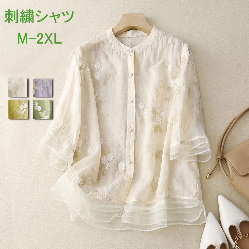 半袖シャツ 切り替え レディース 刺繍 レディースファッション 続々登場 ベージュ グリーン パープル イエロー M L XL 2XL