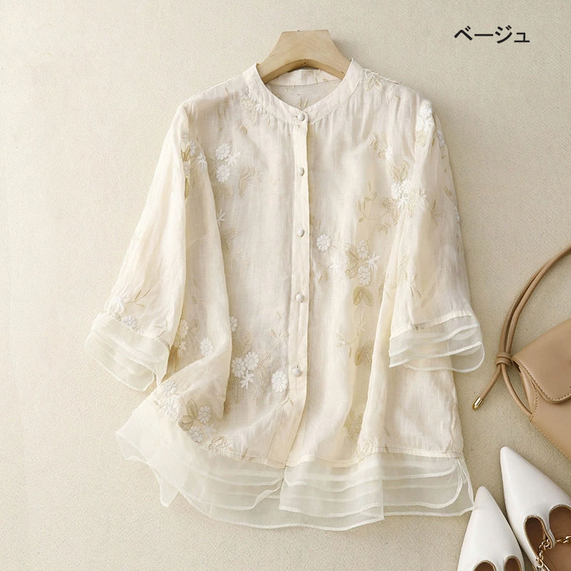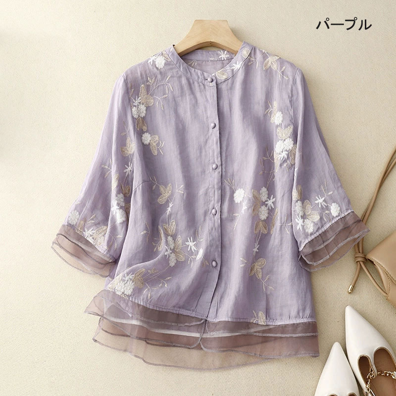 半袖シャツ 切り替え レディース 刺繍シャツ 刺繍 花柄シャツ シャツ ブラウス 半袖 立ち襟 トップス ドッキング 体型カバー ゆったり シャツブラウス シンプル 夏 春 半袖ブラウ 夏シャツ 前開き 五分袖 ブラウス おしゃれ 柔らかい 通気性 流行 大人 かわいい 30代 40代
