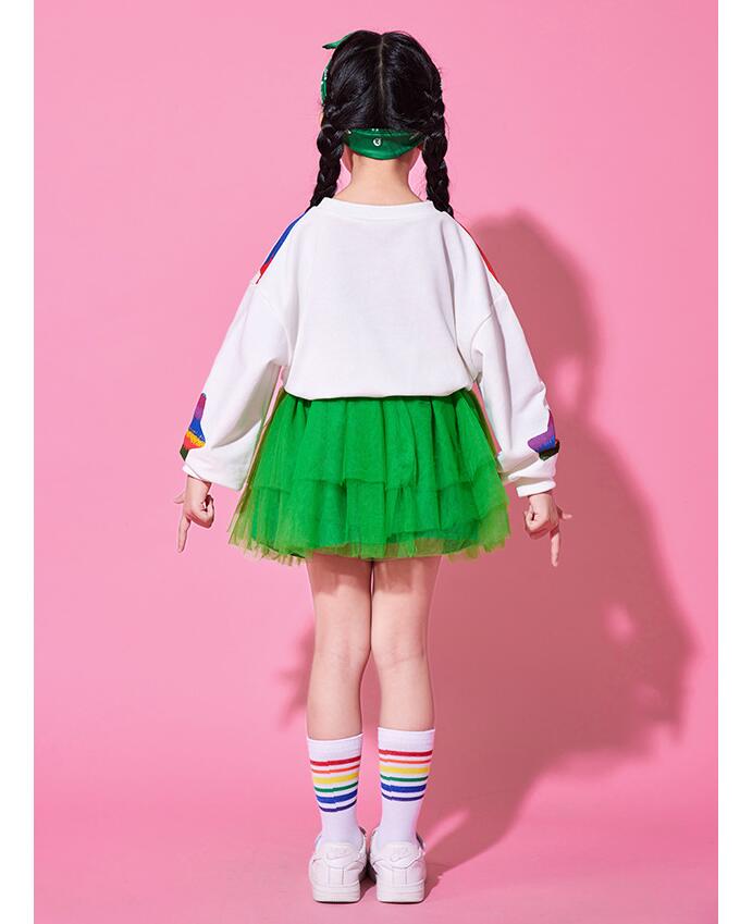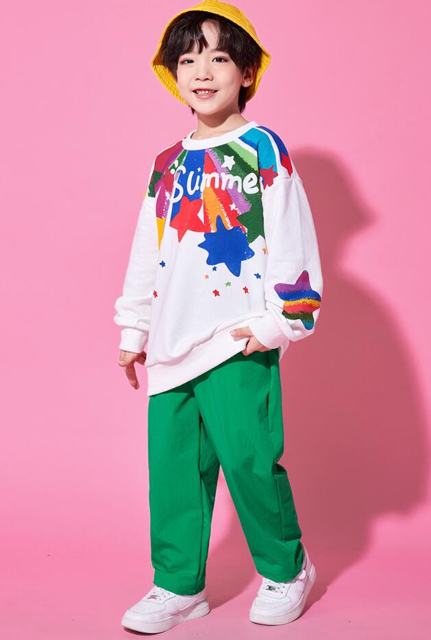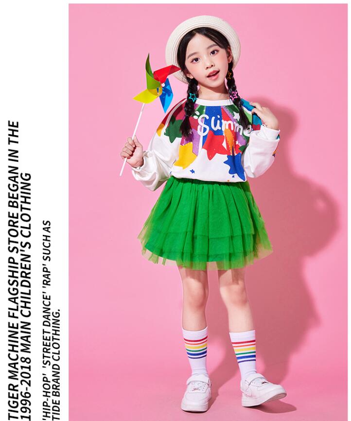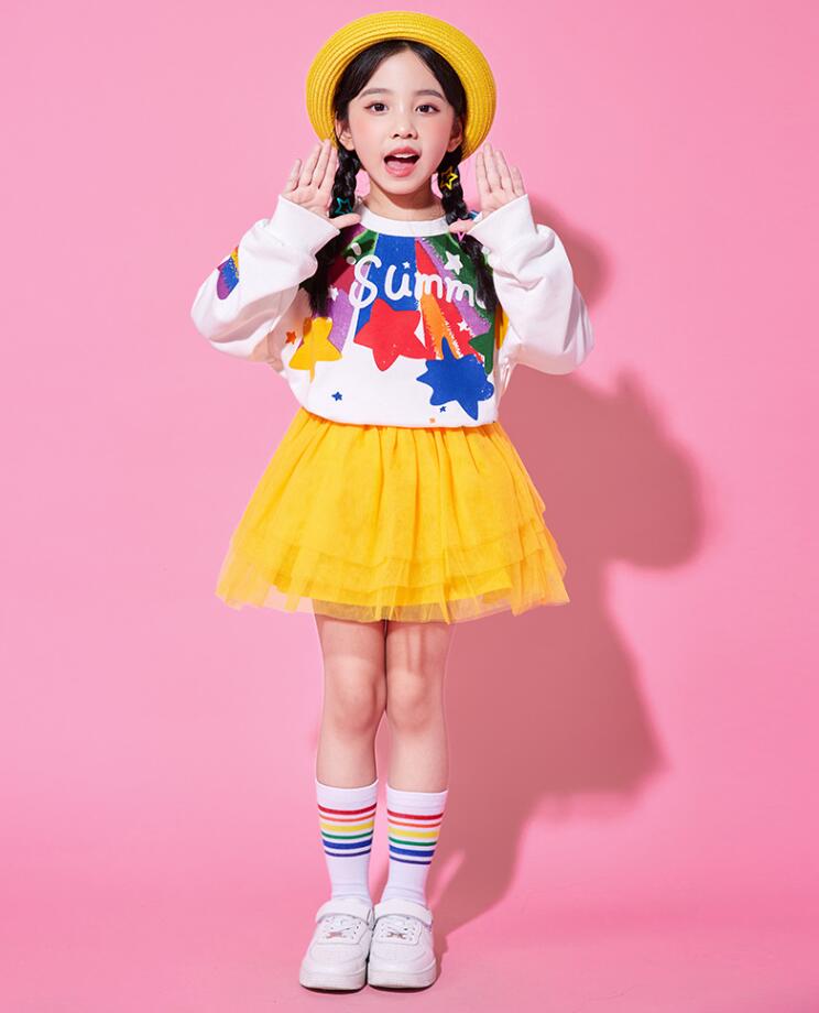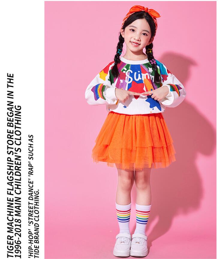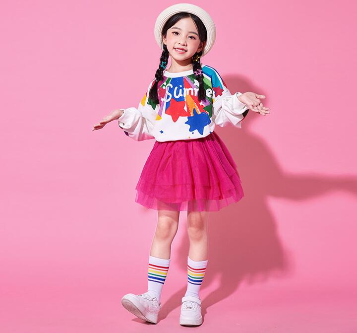 子供ダンス衣装 女の子 男の子長袖tシャツスター柄ロング丈パンツ チュールスカートチアガールヒップホップジャズダンスセット活躍運動会普段着幼稚園服舞台演出服春夏popping