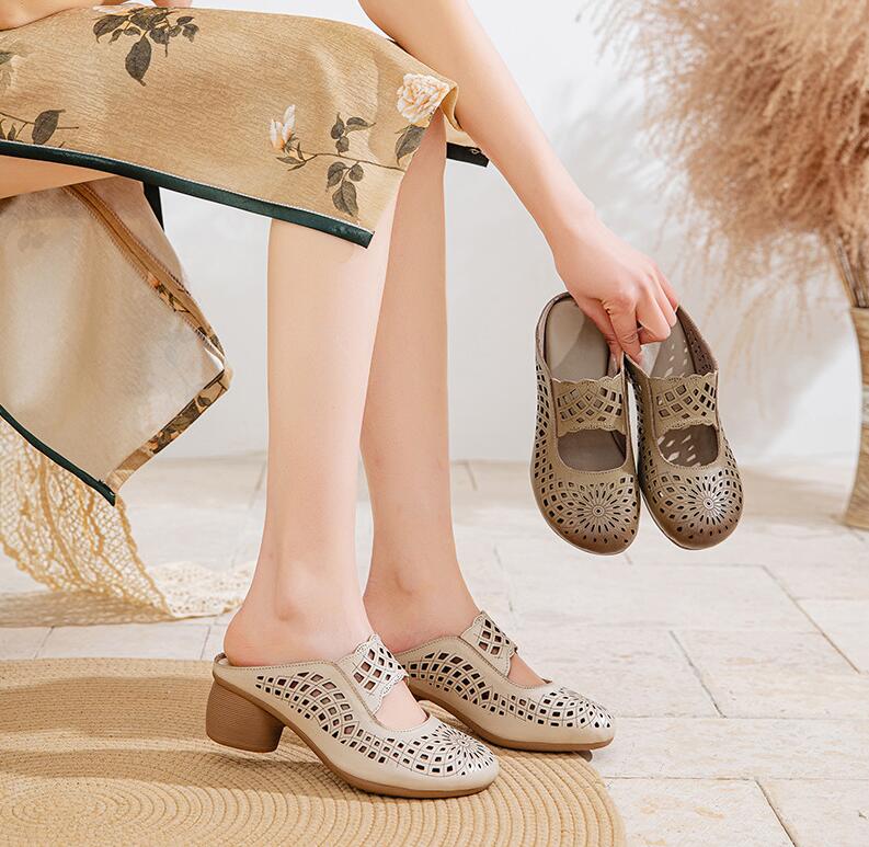 民族風レディーススリッパレザーローヒールサンダルローファーエスニックなシューズ革靴 透かし彫り5cm通気性抜群靴柔らか 歩きやすい 疲れないシューズ 美脚滑りにくいシューズママの日 レトロ