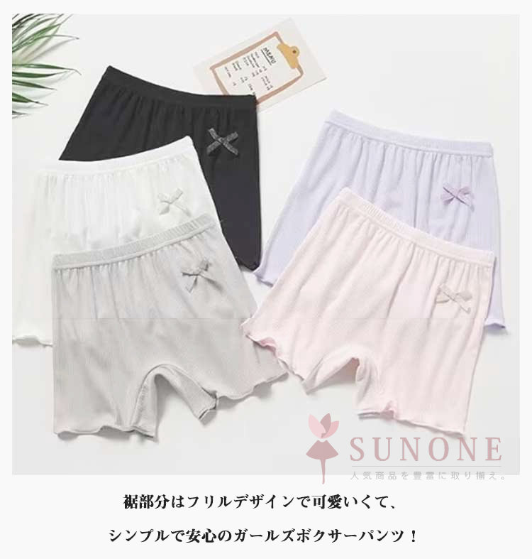 鼠径部を締め付けないボクサータイプのキッズパンツ。裾部分はフリルデザインで可愛いくて、シンプルで安心のガールズボクサーパンツ!リボンがついているほうが前なので、お子様が履く際にわかりやすく、前後間違えにくくなっています。幼稚園、保育園、小学生の女の子には必須アイテム。スカートやワンピース、制服の下にも安心して着用できる!