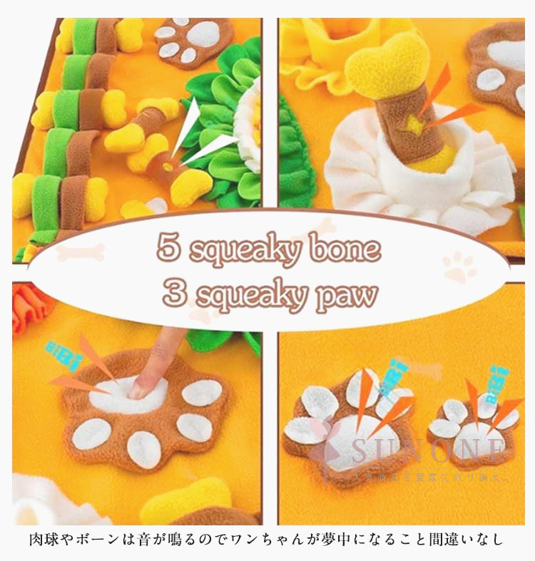 フードやトリーツを隠せる仕掛けがたくさんあり、隠し方を変えれば難易度も上がりもっと楽しめます。種類や年齢を問わずお部屋の中で遊べるおもちゃとして、またシニアには認知症の予防や脳の活性化にもおすすめです。肉球やボーンは音が鳴るのでワンちゃんが夢中になること間違いなしです。