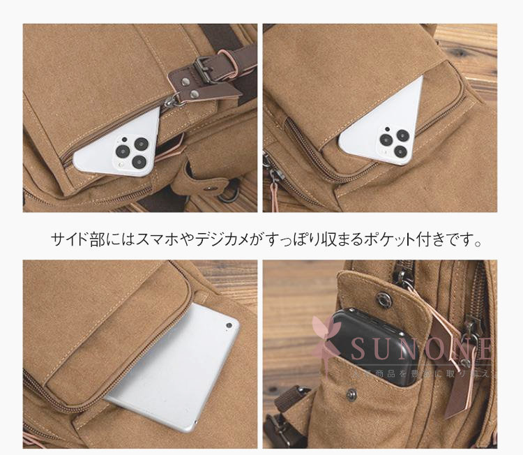 男女問わない高いデザイン性と、機能性を備えたキャンバスバッグ。多機能かつ大容量の便利な2WAYワンショルダー&リュックタイプです。サイド部にはスマホやデジカメがすっぽり収まるポケット付きです。しっかちとした持ち手付きで便利。B5サイズの書籍もスッと入るので大きめの手帳が学習ノートの持ち運びにも最適です。通勤・通学・お出掛け・旅行・アウトドアなど幅広いシーンで大活躍します。