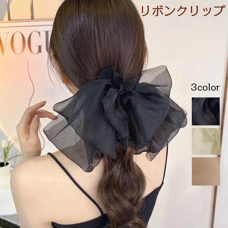 リボン 大きめ ヘアクリップ 結婚式 バレッタ リボンバレッタ ヘアアクセサリー BIG ボリューム シフォン ふわふわ 軽やか 韓国 韓国ガーリー かわいい ブラック アイボ レディ