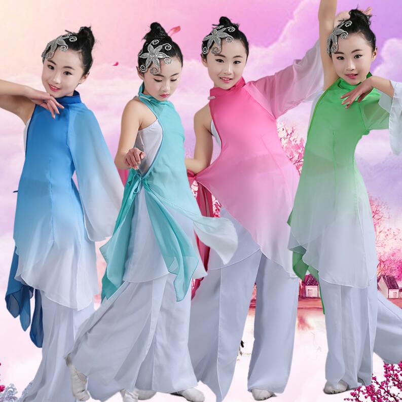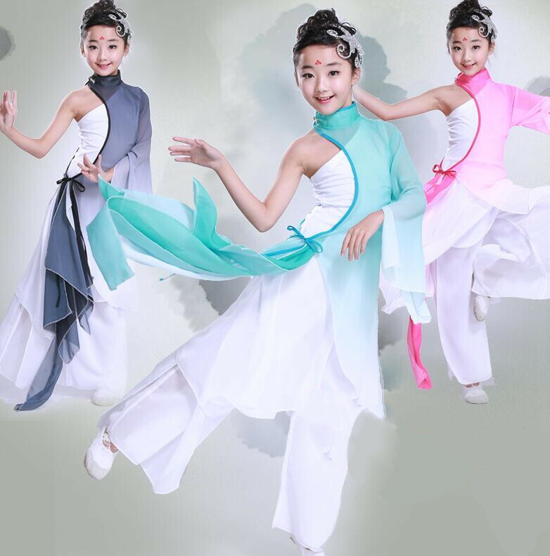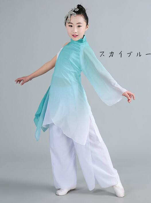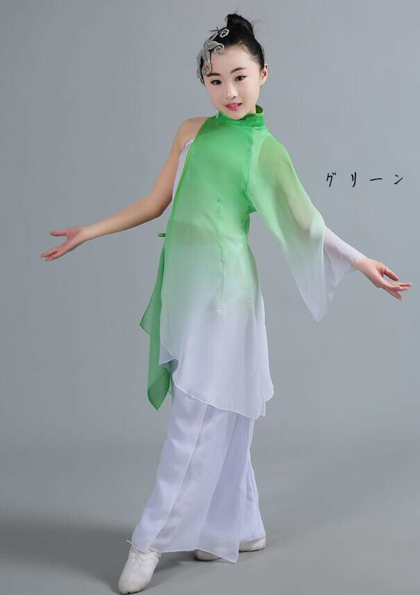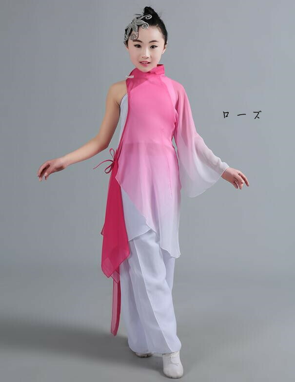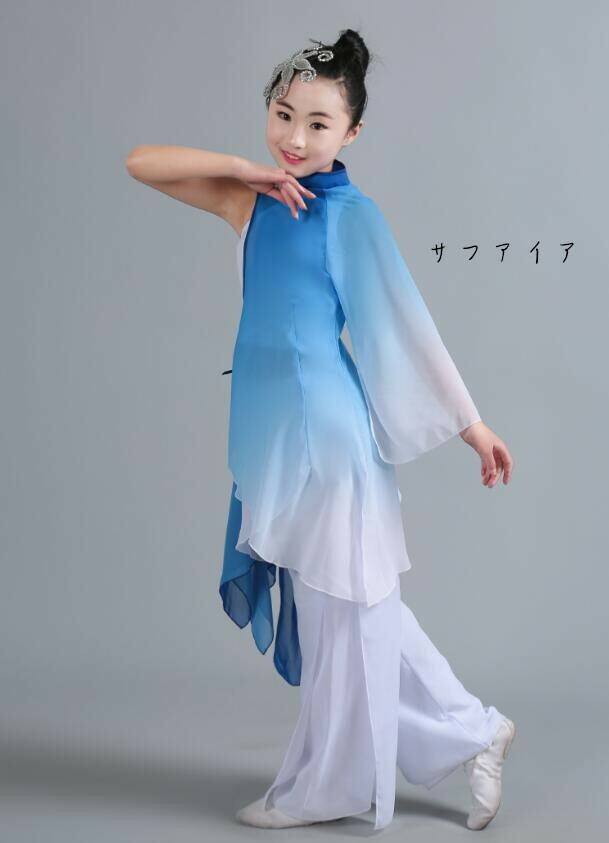 女の子 ダンス衣装 中華風演出服 ステージウェア 上下3点セット 子供服 シフォン フレア袖 グラデーション 古典ダンス 楽器演奏 扇子ダンス 学園祭 文化祭 イベント エスニック 5色 1 撮影衣装