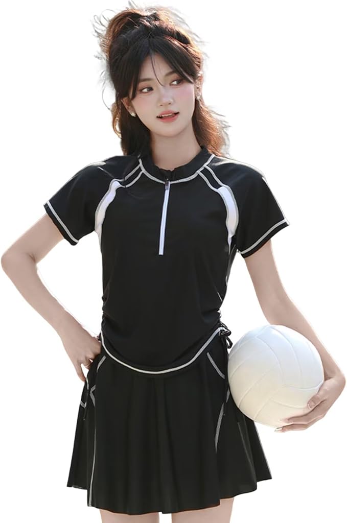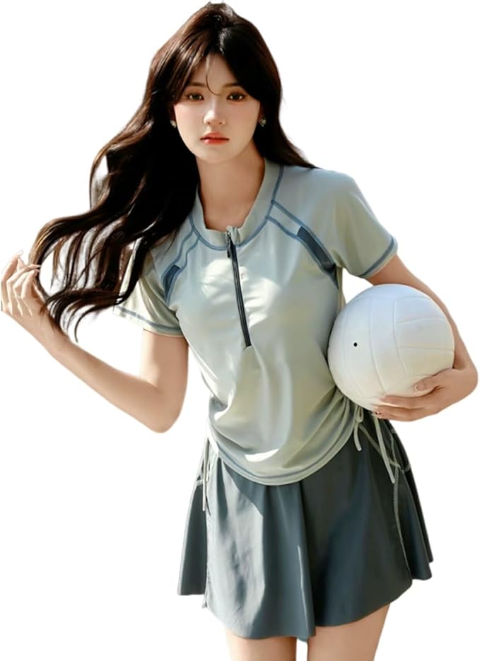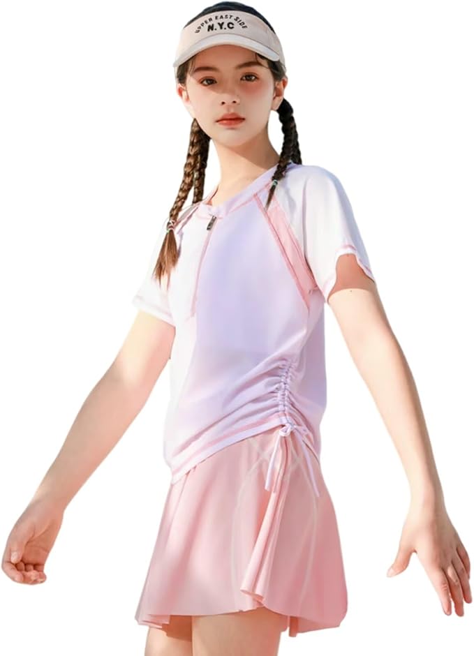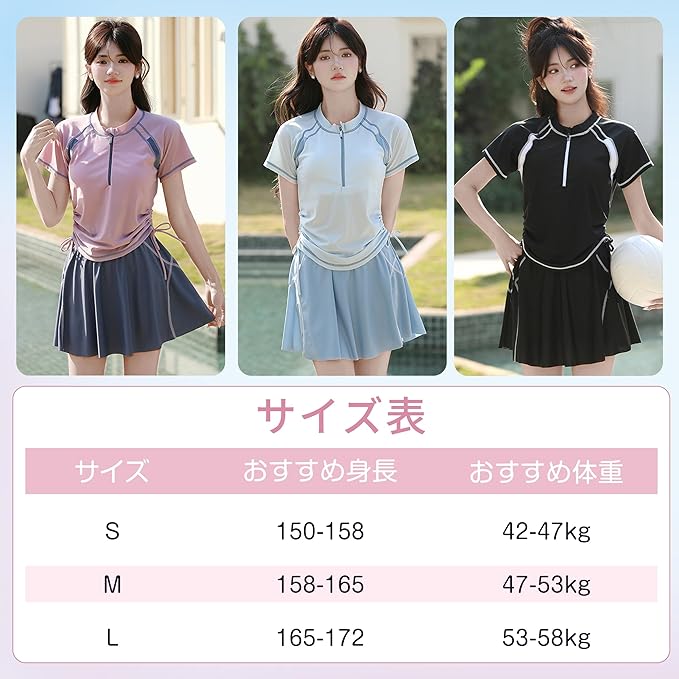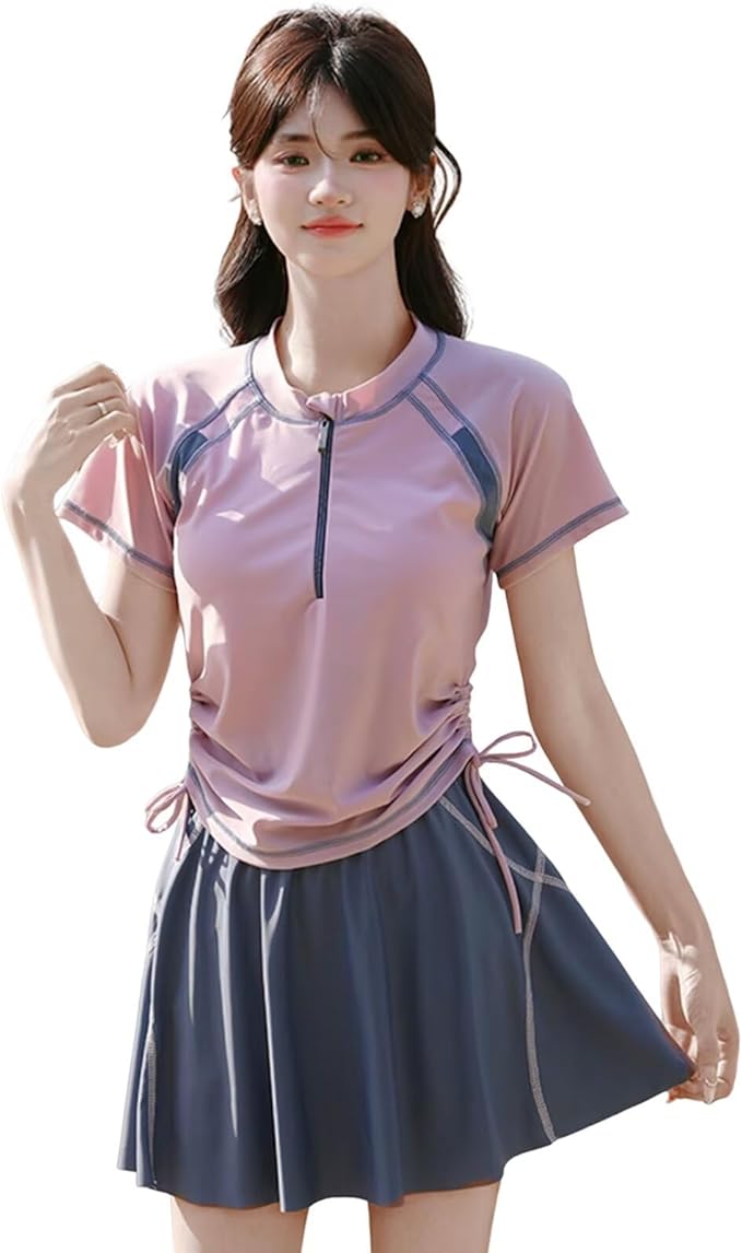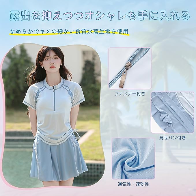 [Kayiyasu] 水着 レディース セパレート 2点セット タンキニ 半袖 ラッシュガード スカート 見せパン付き パット付き 学生 水泳 フィットネス S-L