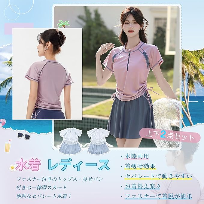 水着 レディース セパレート 2点セット タンキニ 半袖 ラッシュガード スカート 見せパン付き パット付き 水泳 フィットネス S-L 学生