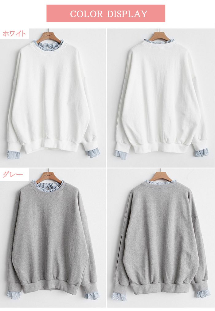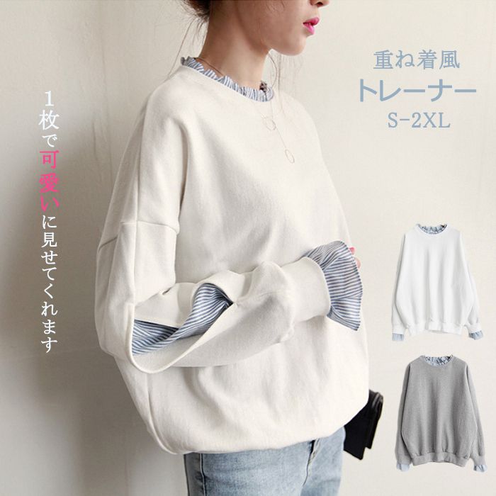 この春、重ね着風のトレーナーでおしゃれを楽しみませんか このトップスは、1枚で簡単にかわいいレイヤードスタイルが完成する優れものです。薄手でゆったりとしたデザインなので、体型カバーもばっちり。通学や通勤、オフィスでも活躍すること間違いなしです。20代から50代まで、幅広い年代の方にぴったりのアイテム。