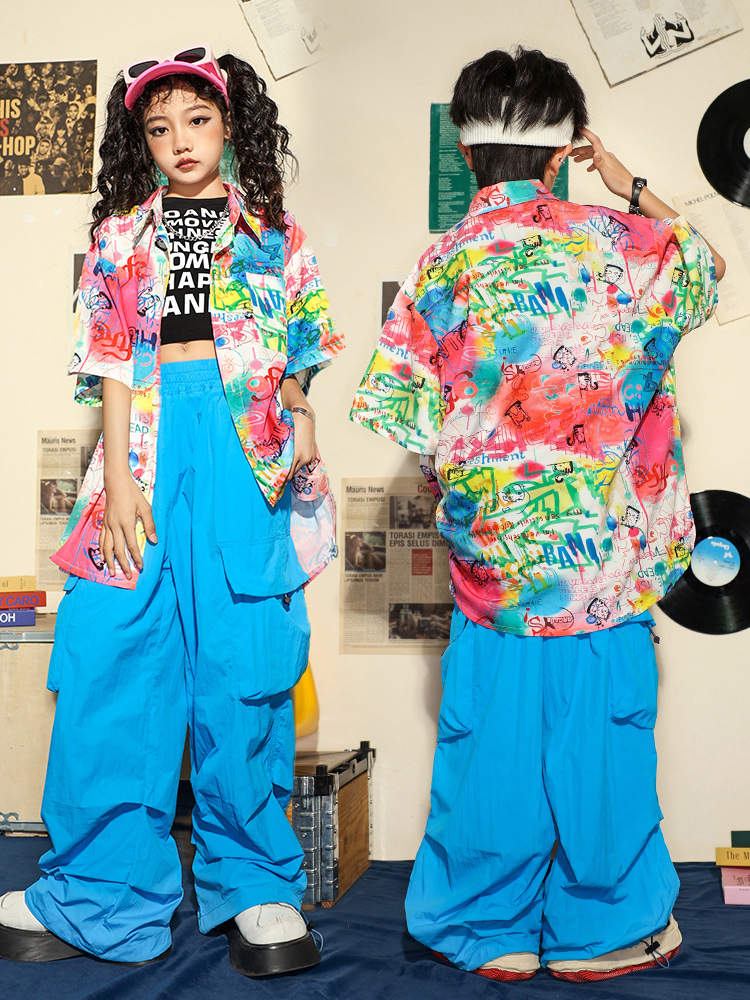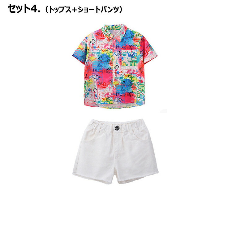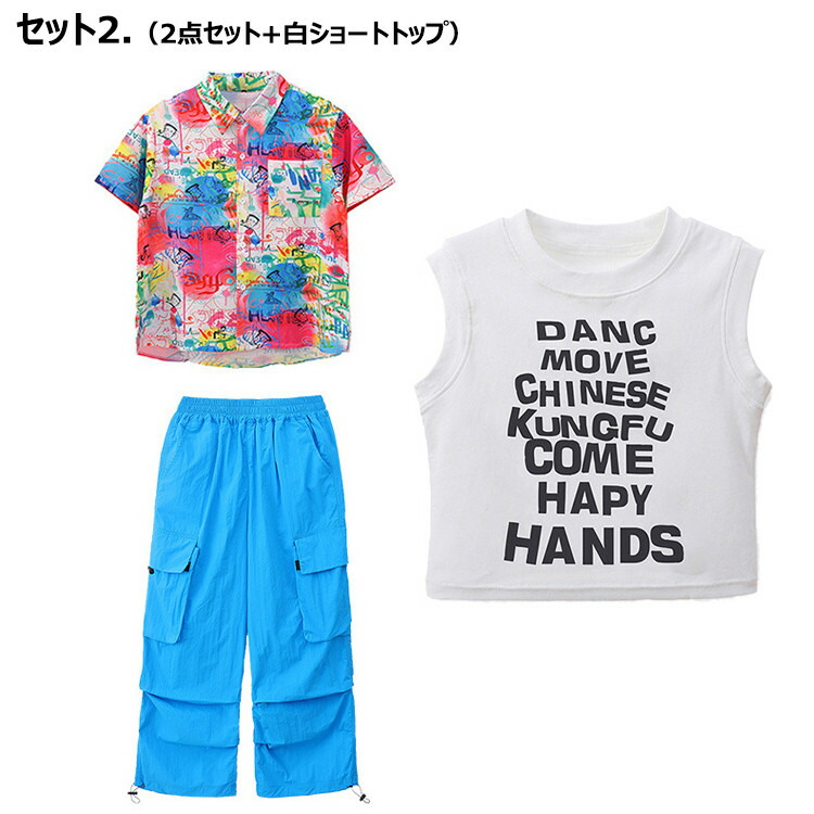虹色 柄シャツ 総柄 女の子 チア 青色 キッズ ダンス衣装 セットアップ 半袖 シャツ 男の子 黒 タンクトップ へそ出し トップス 白 ショートパンツ ヒッフポッフ ジャズダンス 韓 ワイドパンツ