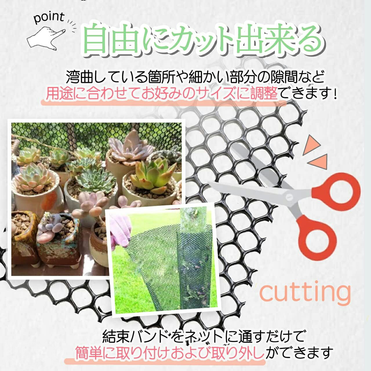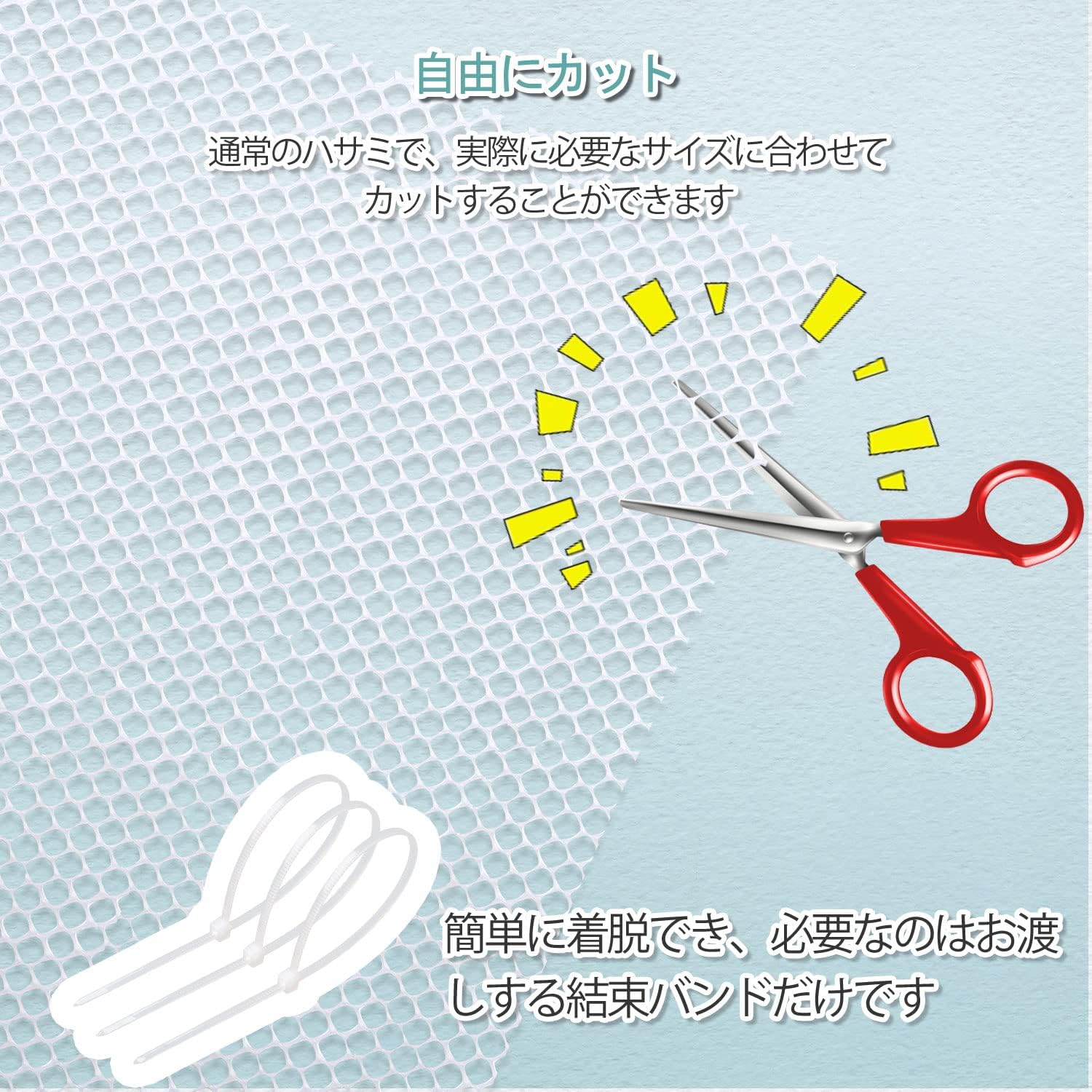 自由にカットが出来ますので、湾曲している箇所や細かい部分の隙間など用途に合わせてお好みのサイズに調整できます!結束バンドをネットに通すだけで、簡単に取り付けおよび取り外しができます!