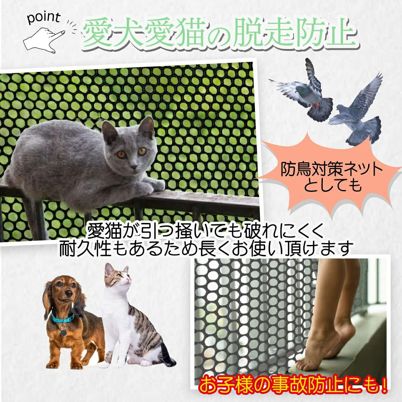 バルコニーやベランダにはもちろん、野菜や果物などの防鳥対策ネットとして、愛犬愛猫の脱走防止にもご使用頂けます!