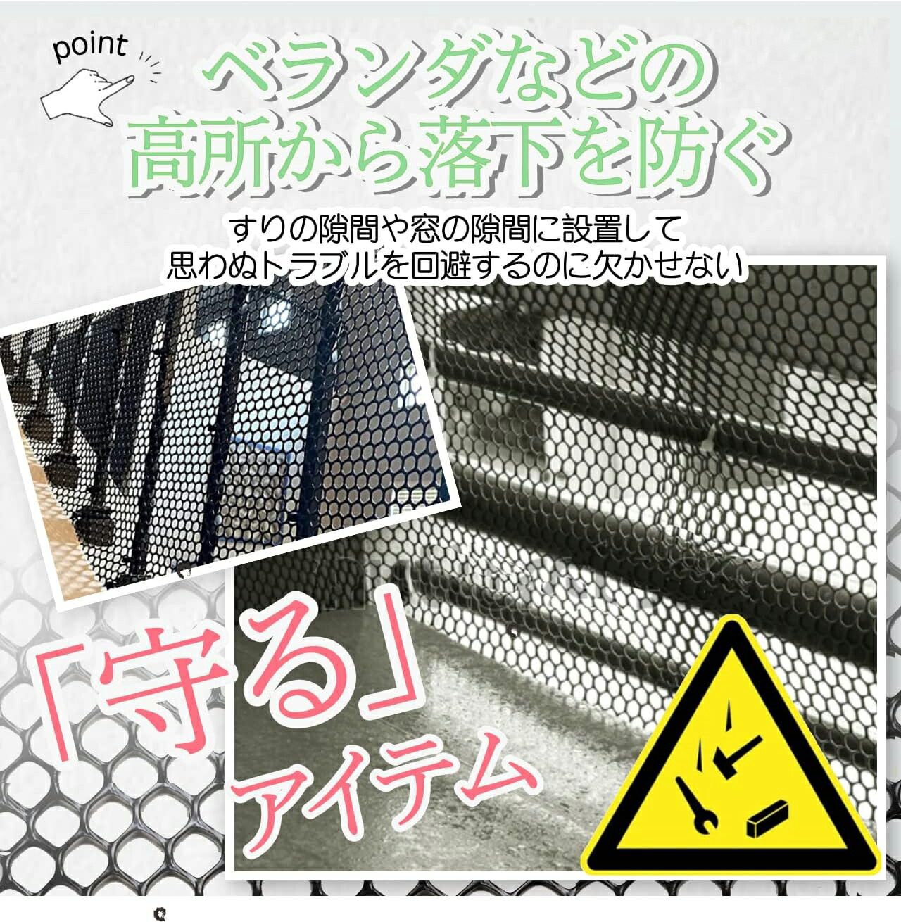 ベランダや窓などの高所から落下を防ぐプラスチック素材のネット!手すりの隙間や窓の隙間に設置して思わぬトラブルを回避するのに欠かせない「守る」アイテムです。