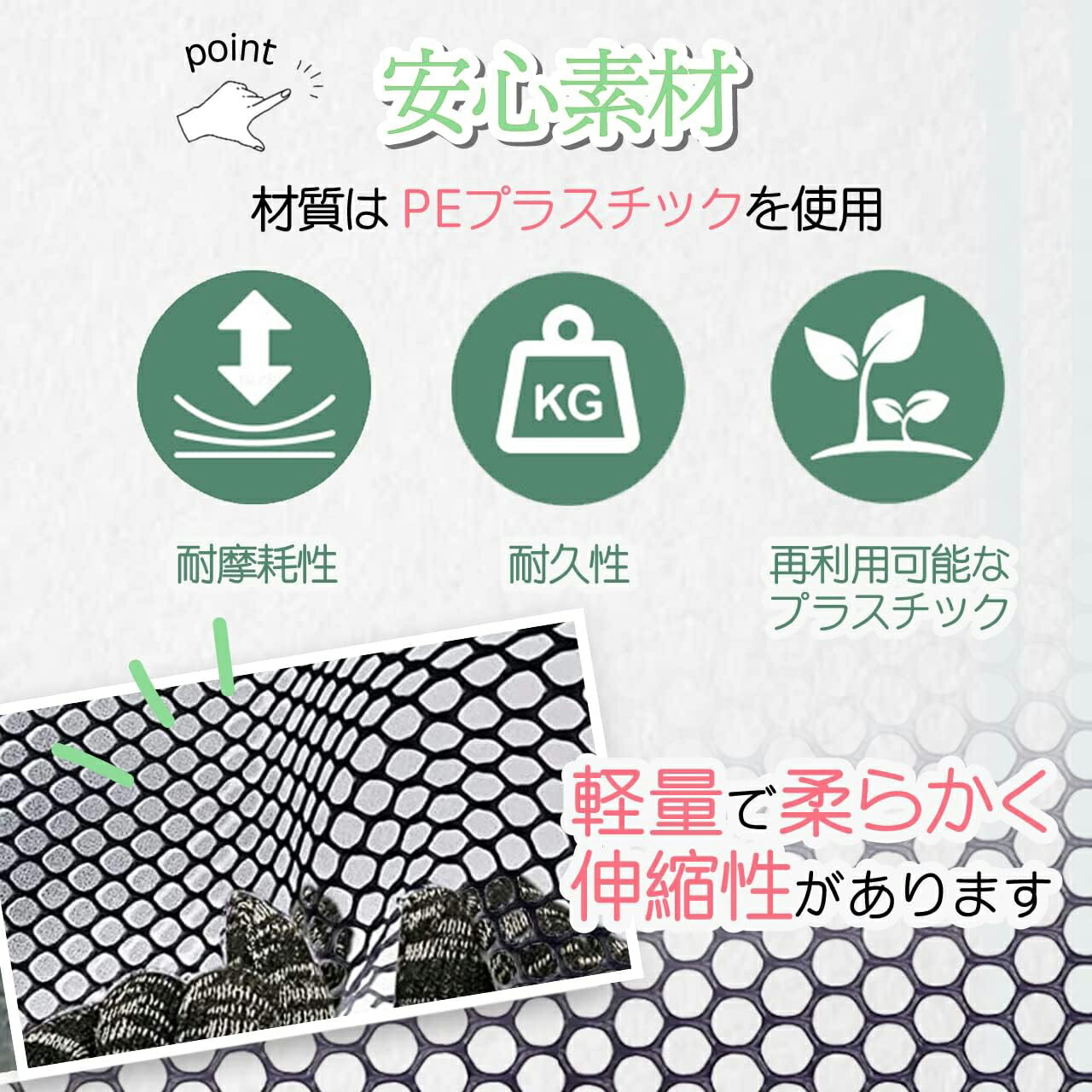 材質はPEプラスチックでできており、日光に強く、耐久性・耐摩耗性・腐食防止に優れ、長時間使用しても色あせや剥がれがありません!また、軽量で柔らかく伸縮性があり、曲げたりカットしたりできます!