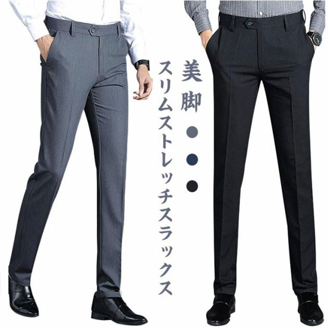 スラックス スリム メンズ ビジネスパンツ ストレッチ パンツ 紳士 ズボン ボトムス サラサラ ビジネス 洗える 細身 美脚 ロングパンツ クールビズ 大きいサイズ 通勤 無地 春 夏 秋 水洗い