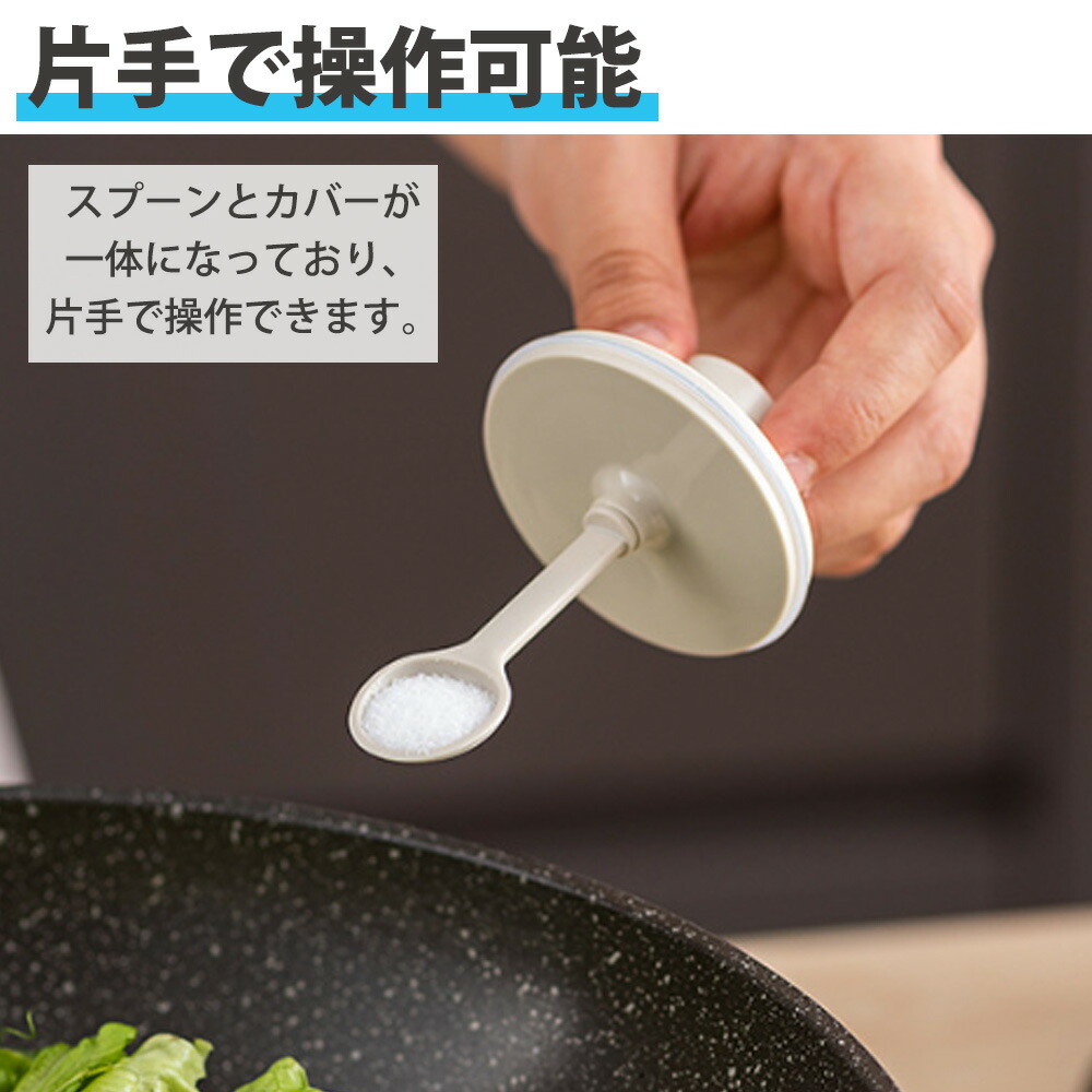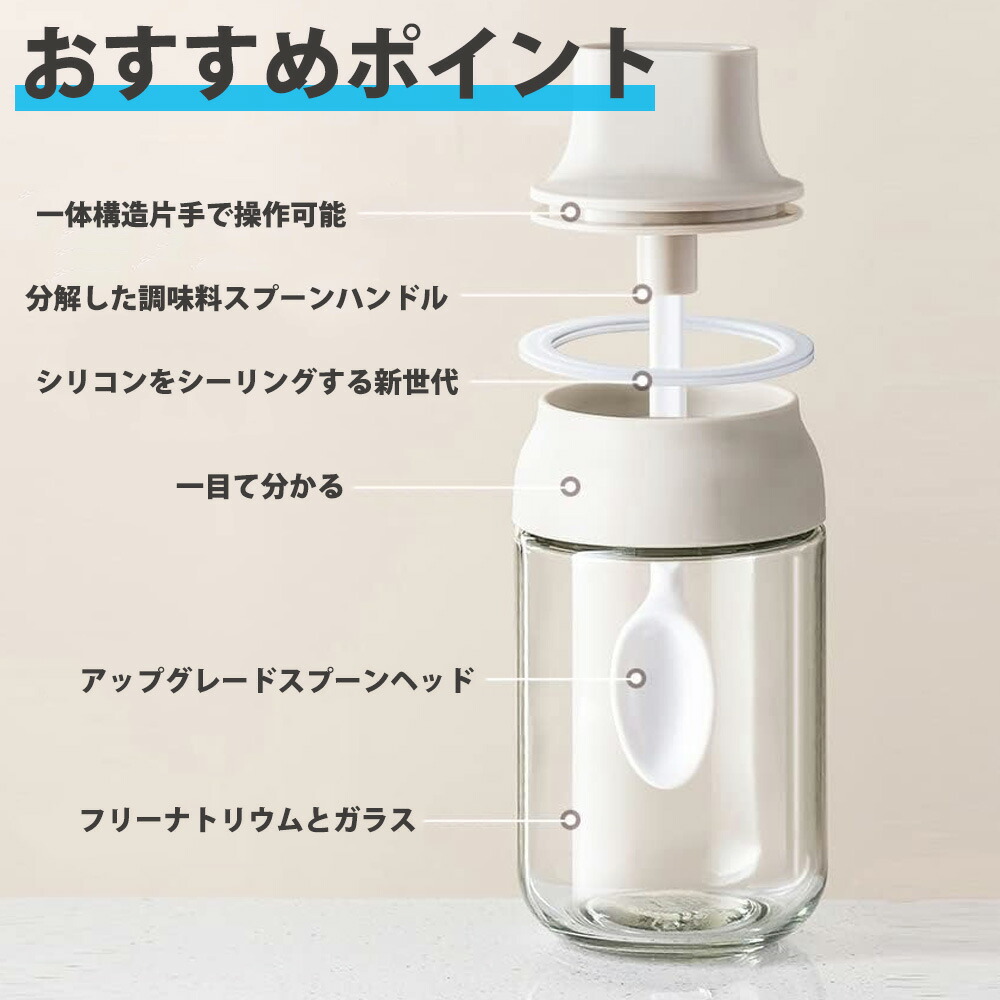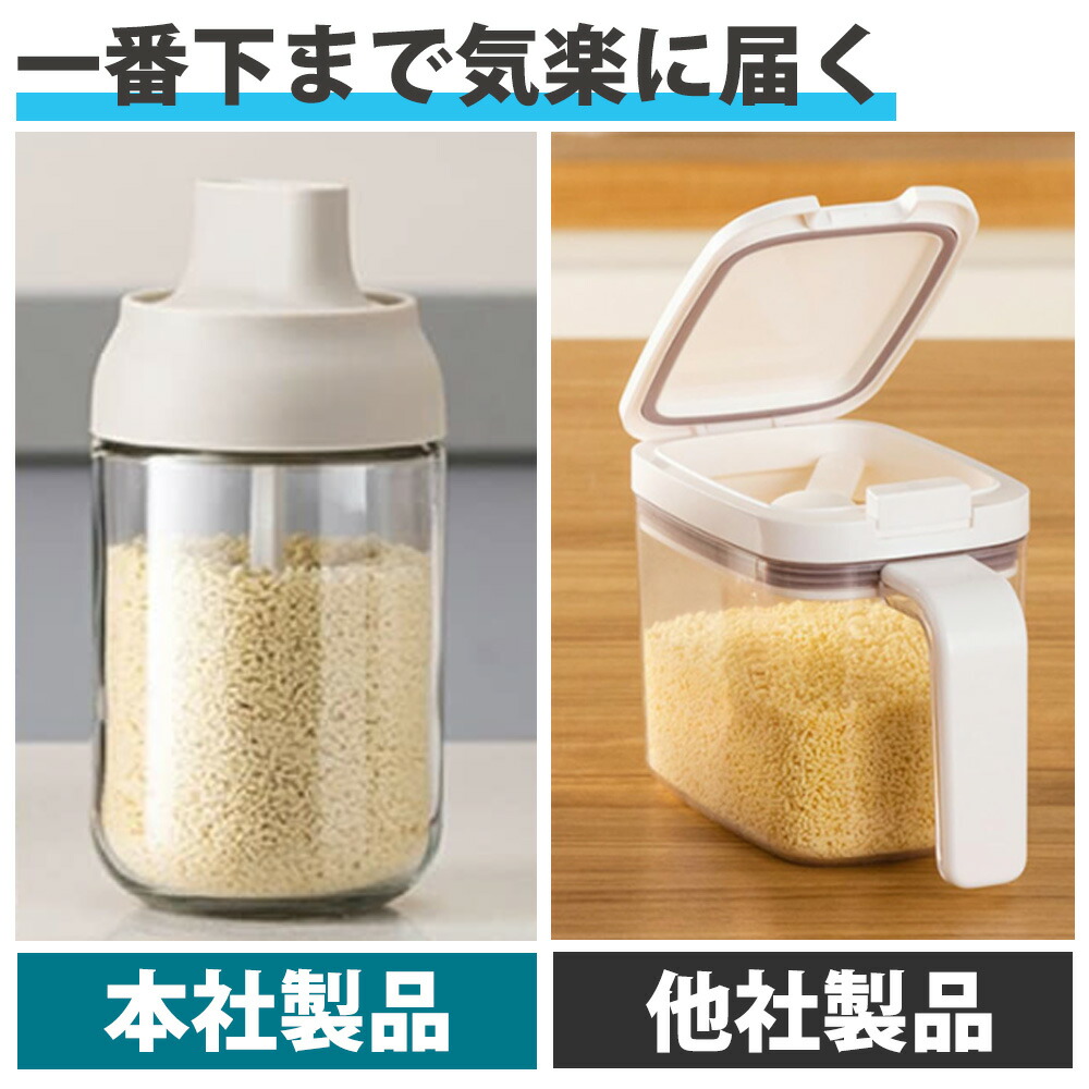 一体構造片手で操作可能:フタと一体になる、スプーン付き。調味料が満杯になっても気楽に蓋を閉めます。一番下まで届きますので調味料を使い切ることができます。