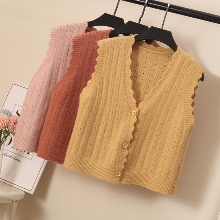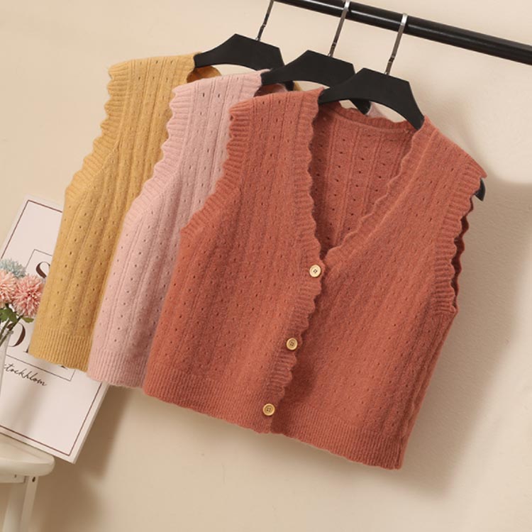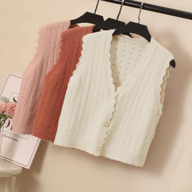 全10色×5サイズ 波模様ニットベスト前開きベストニットベストニットカーディガンVネックショート丈透け編みニットトップスライト羽織シンプルかわいい春秋