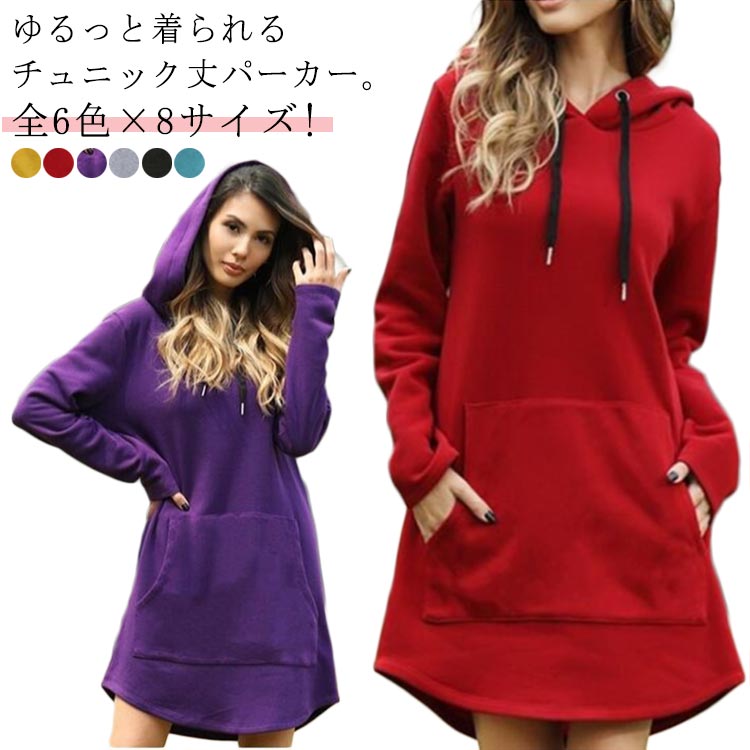 全6色×8サイズ!ゆるっと着られるチュニック丈パーカー。