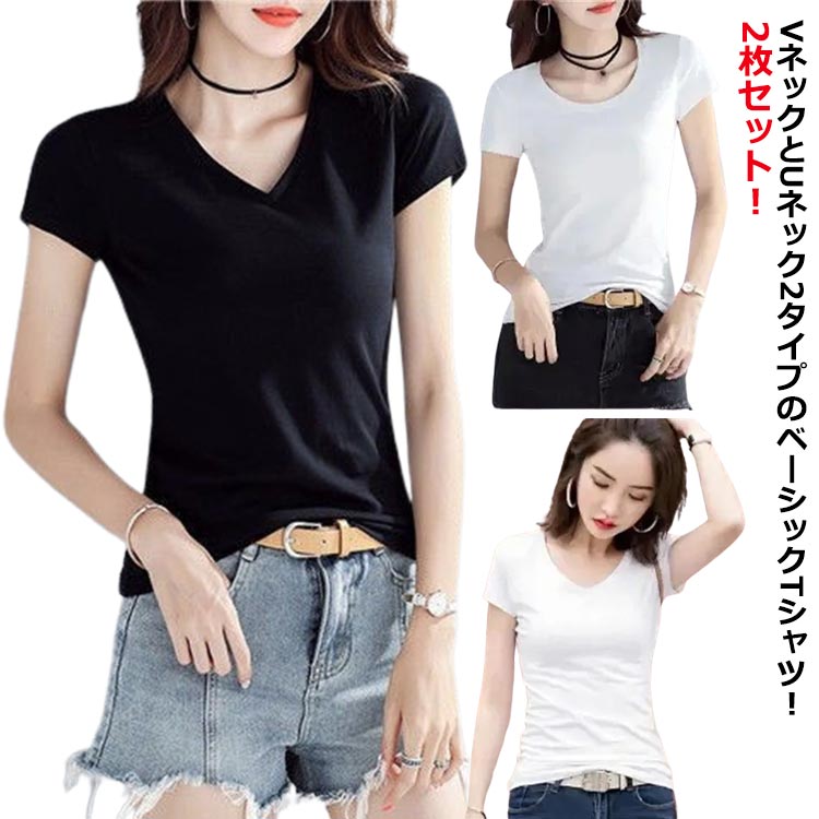 2枚セット Tシャツ Vネック Uネック 丸首 レディース 半袖 カットソー 無地 夏 トップス プルオーバー スーツ インナー スリム 細身 カジュアル おしゃれ シンプル 大きいサイズ