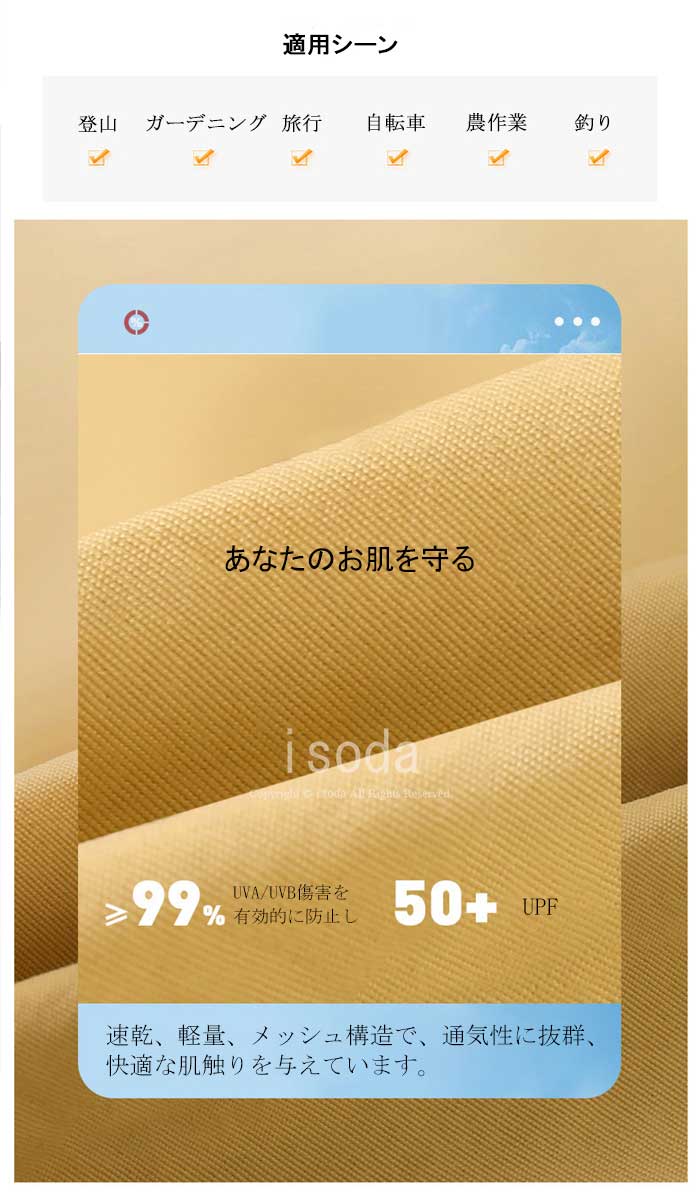男女問わず、登山、ハイキング、ウォーキング、日常レジャー、アウトドアスポーツ、夏場の暑い日差しの中での長時間の屋外作業などのシーンで、日除け・紫外線対策に大活躍間違いなし!