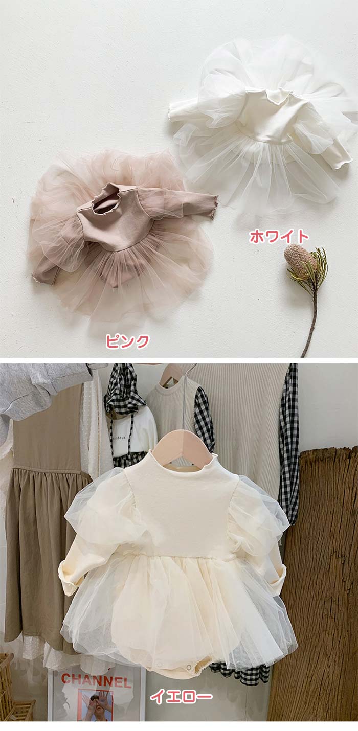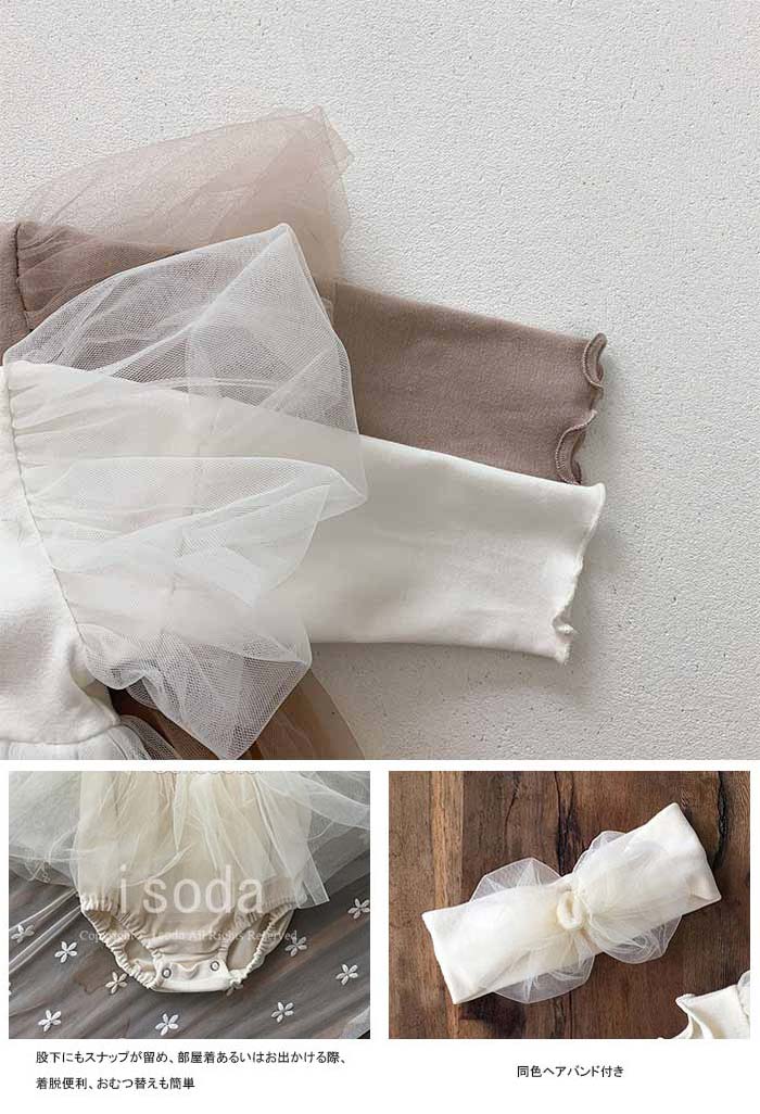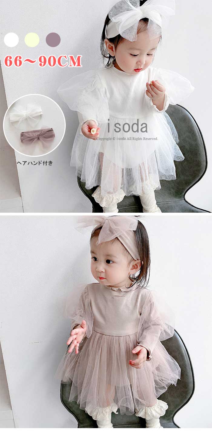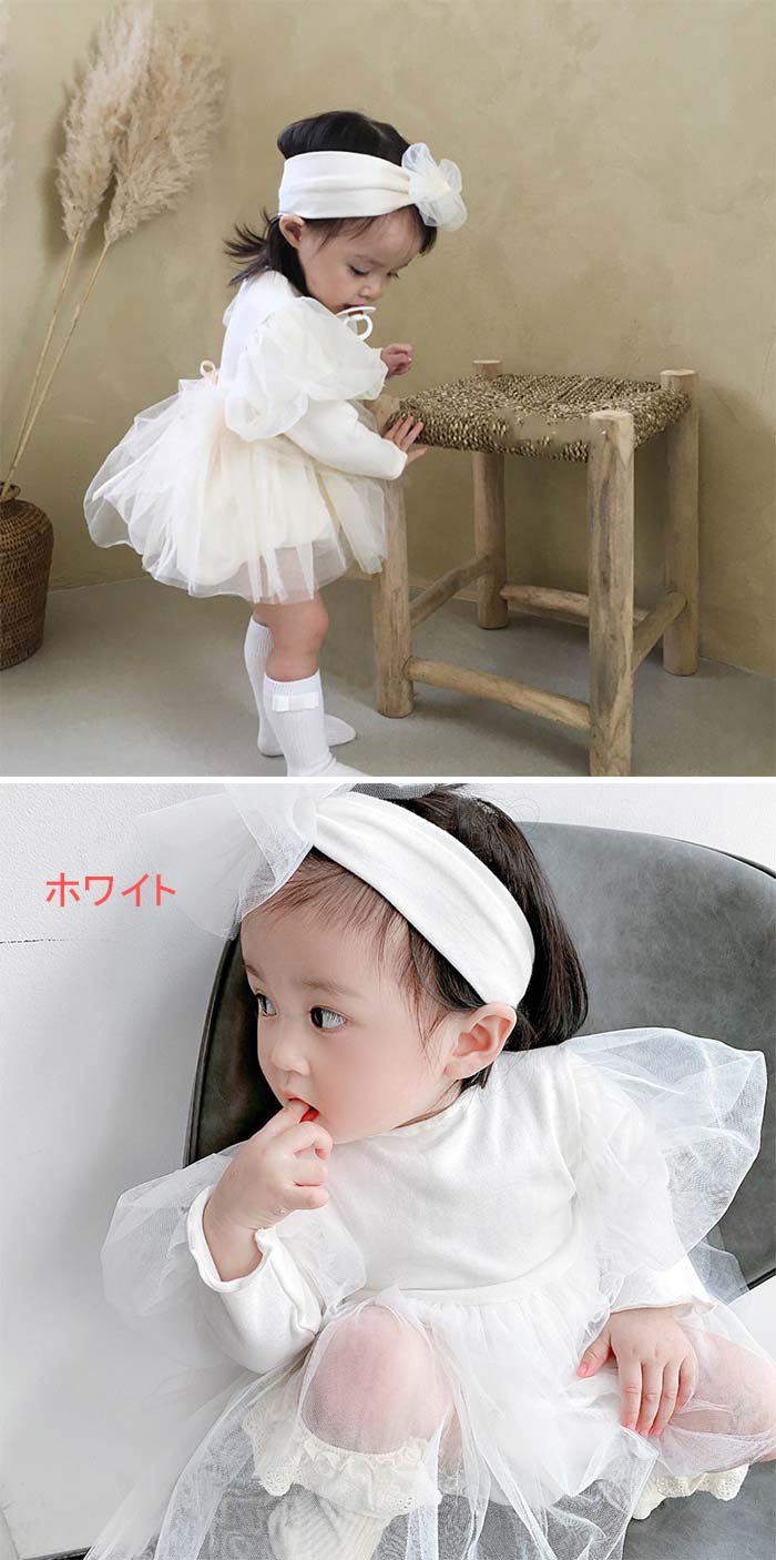 ベビー ワンピース ロンパース ベビードレス 女の子 半袖 長袖 チュール ヘアバンド付き ベビー服 秋 白 セレモニードレス 新生児 フォーマル