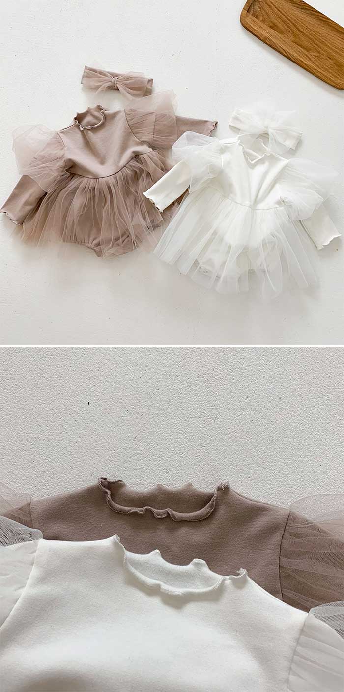 ベビー服 長袖ワンピース女の子春秋 チュールスカートカバーオール髪飾り 赤ちゃん出産準備贈り物フリル無地ホワイト