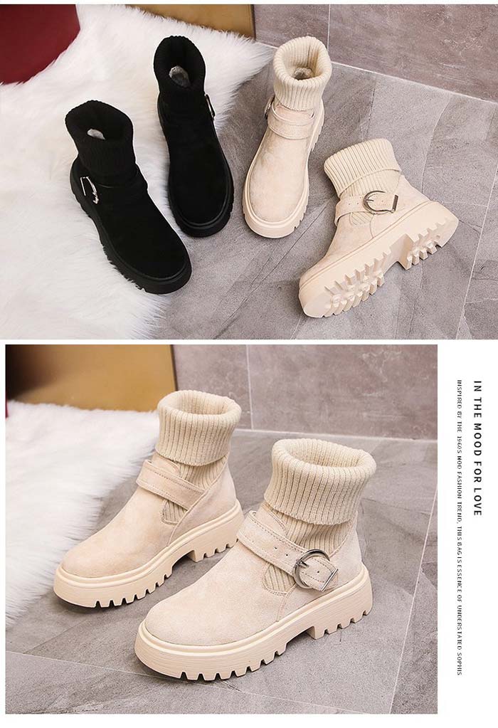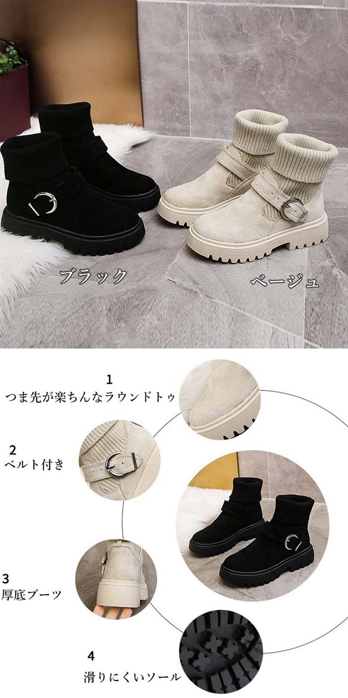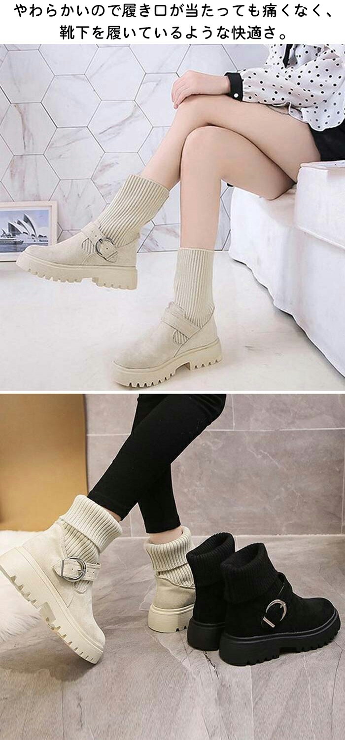 ソックス風 ショートブーツ レディース 2wayニットブーツ バックルベルト 厚底ブーツ 歩きやすい ハイカット ブーツ おしゃれ