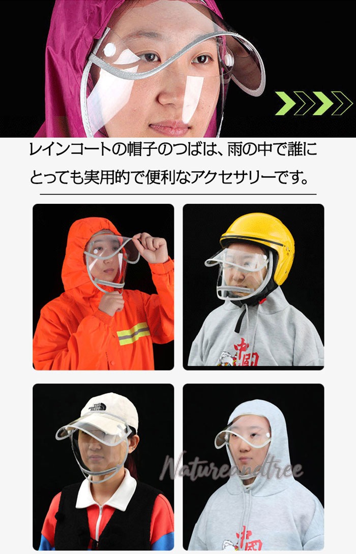 商品詳細 透明な素材により、雨の中でもはっきりと見えるため、 濡れて滑りやすい状況でも簡単に移動できます。 帽子のつばはシンプルな構造なので取り付け、 取り外しが簡単で、いつでもどこでも使用できます。 帽子のつばはレインコートに簡単に合わせることができ、 激しい雨でも濡れずに快適に過ごせます。 透明なプラスチック素材が雨水から顔を効果的に守り、 雨水が顔にかかって不快感を引き起こすのを防ぎます。 レインコートの帽子のつばは、 雨の中で誰にとっても実用的で便利なアクセサリーです。