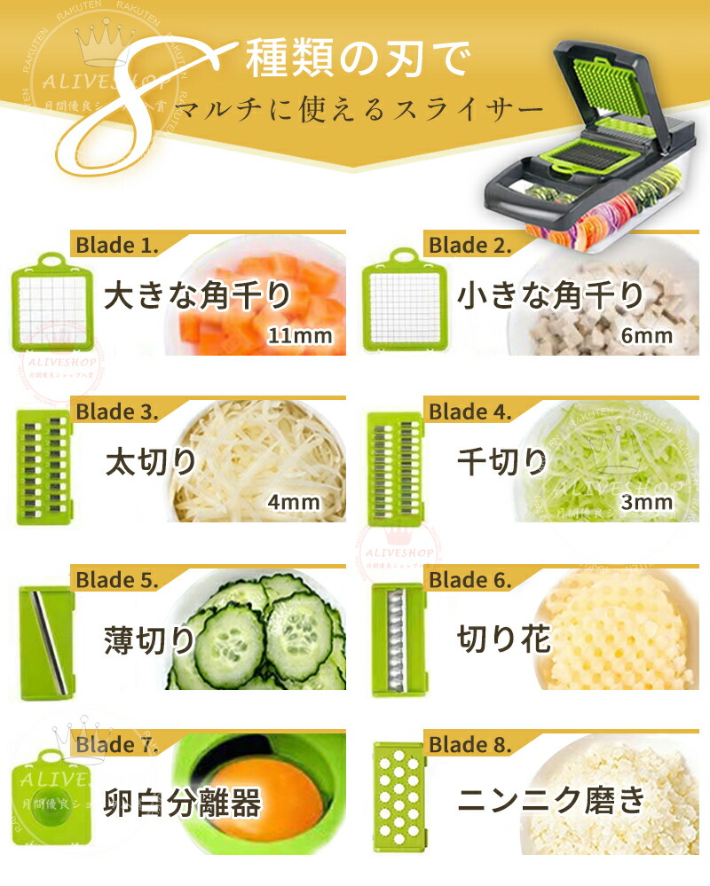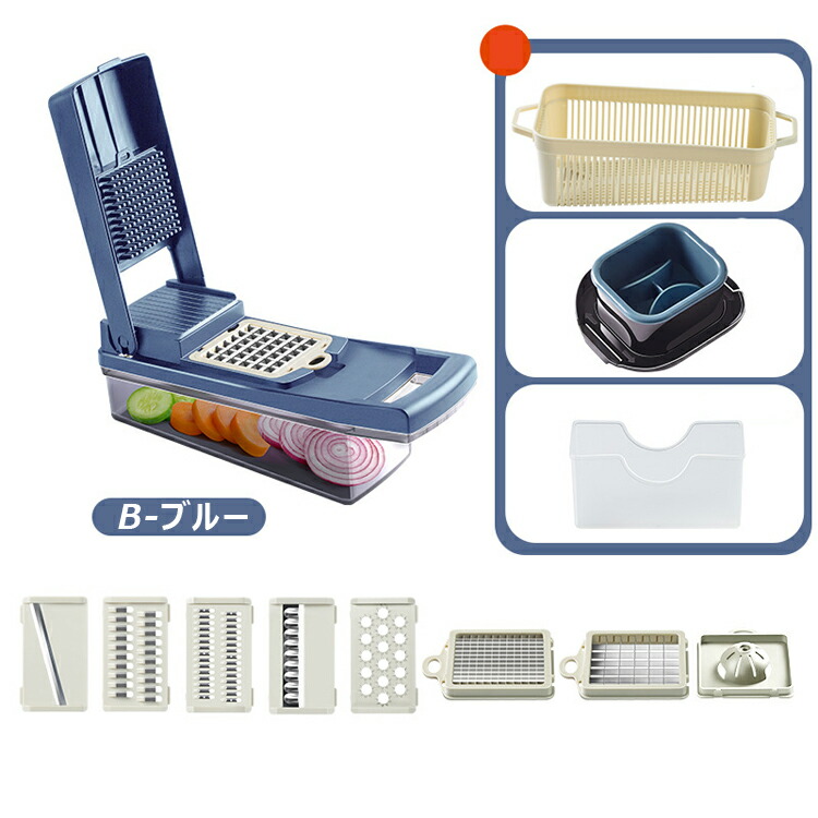 【B-ブラック B-ブルー B-グリーン】15点セット:薄切り/千切り/太切り/大きな角切り/小さな角切り/卵白分離器/切り花/ニンニク磨き/ハンドホルダー/排水バスケット/収納ボックス/押圧器/本体/ブレード収納/クリーンシート