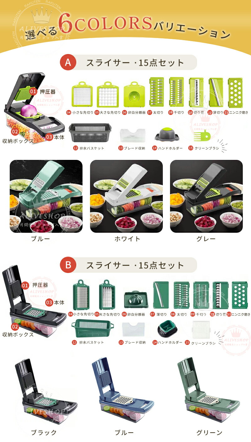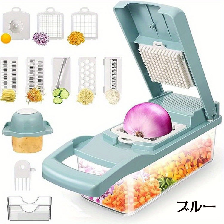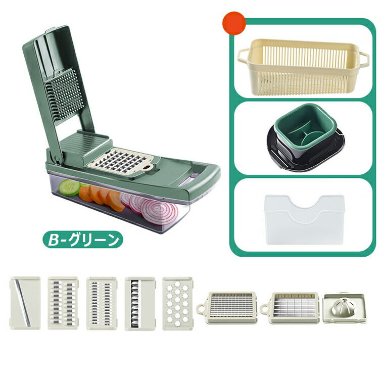 【グレー ブルー グリーン】15点セット:薄切り/千切り/太切り/大きな角切り/小さな角切り/卵白分離器/切り花/ニンニク磨き/ハンドホルダー/排水バスケット/収納ボックス/押圧器/本体/ブレード収納/クリーンブラシ