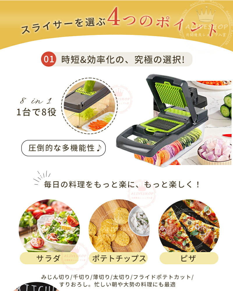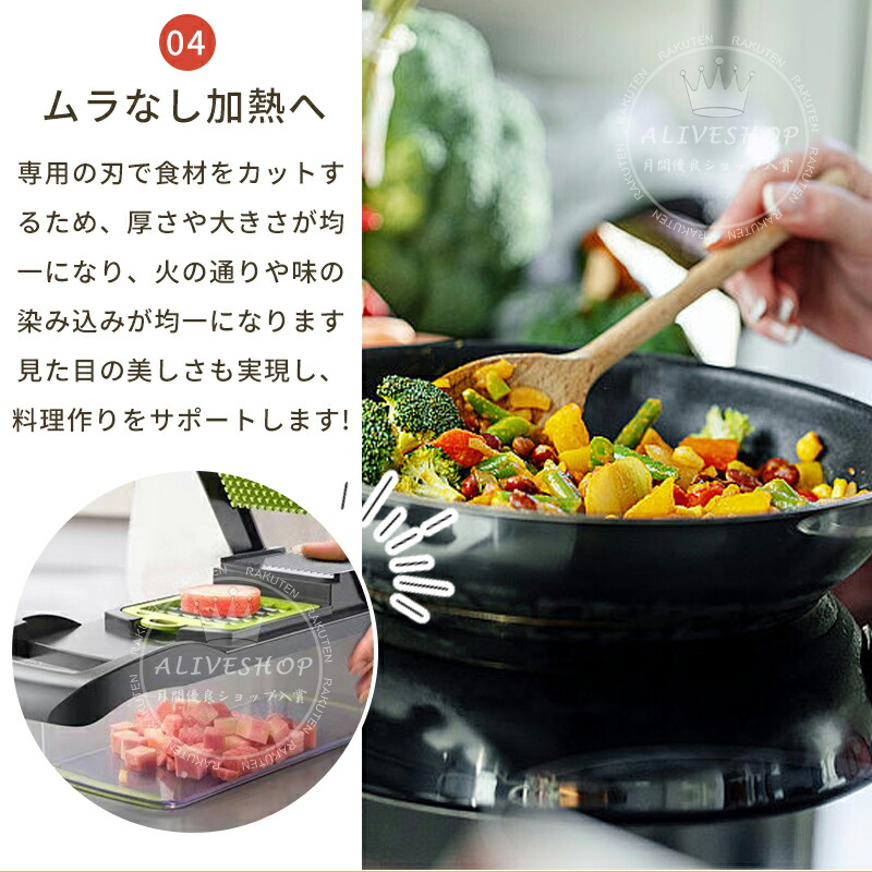 スライサーには食品グレードの素材を採用しており、エコで環境に優しい。安全ホルダーで小さくなった野菜を掴めることで、手を切る心配まったくないで、安全にスライスできます。容器の底部には滑り止め付きによって、スライスしたり、カットしたりの時の安定性を向上します。野菜が飛び散らず便利です。