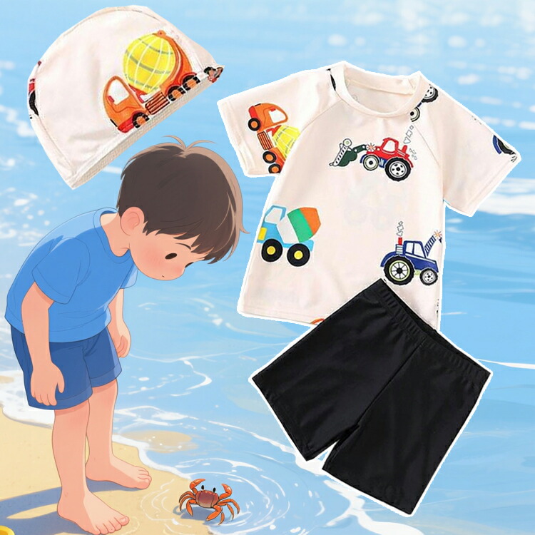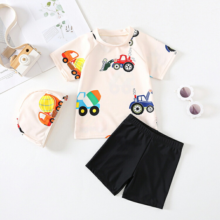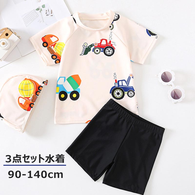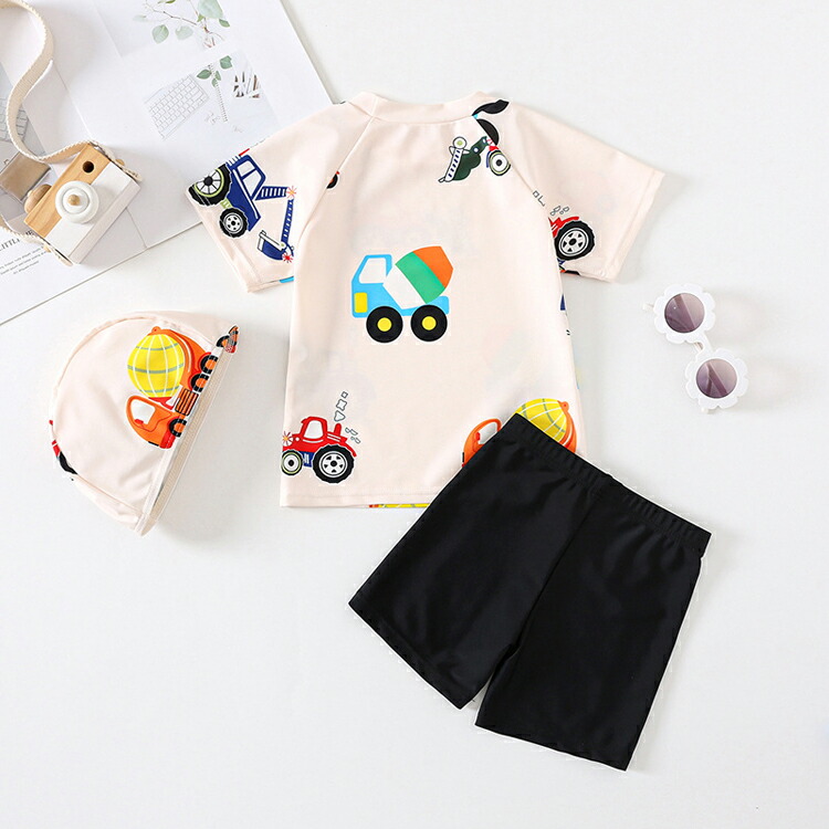 3点セット ベビー 水着 男の子 みずぎ 車柄 半袖 半ズボン 上下セット ラッシュガード セットアップ 幼稚園 小学生 キッズ水着 ジュニア 子供 スイムウェア スイミング プール スクール水着