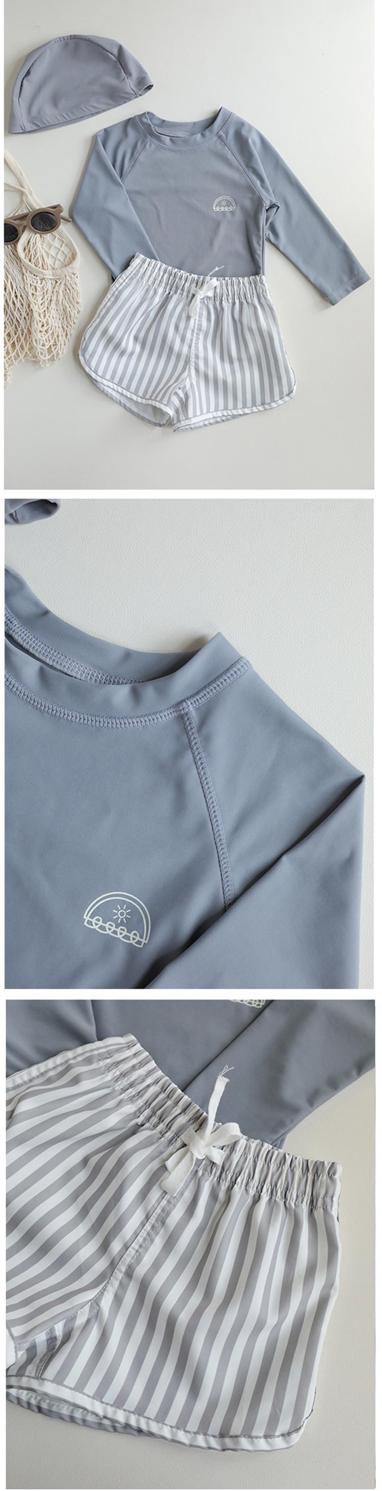 【着回し自在のキッズ水着】セットアップなので日焼け対策しながらもおしゃれです。長袖のラッシュガードと帽子でUVケアもバッチリ!シンプルなデザインだから、学校に入った子どもにもおすすめです。