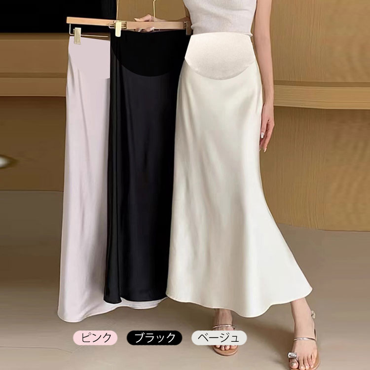 マタニティ ロングスカート サテンスカ マタニティ ママ マタニティウエア 授乳服 ボトムス スカート 新作 ブラック ベージュ ピンク M L XL 2XL