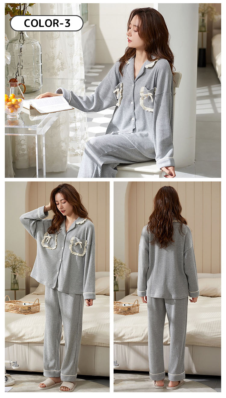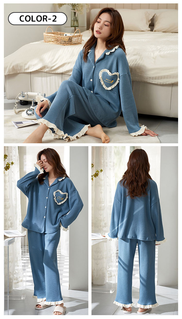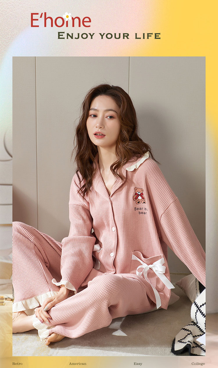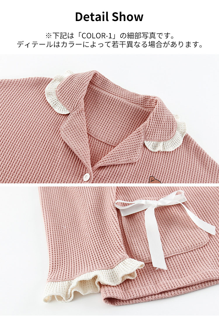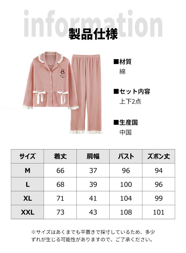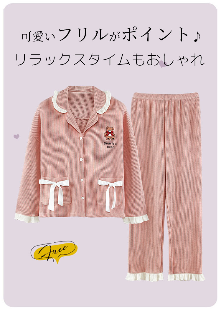 パジャマ レディース ルームウェア 女の子 可愛い おしゃれ フリル 長袖 前開き 春 秋 テーラー襟 上下2点セット 大学生 寮生活 柔らかい 通気性 クマ リボン フェミニン ガール ピン ハート