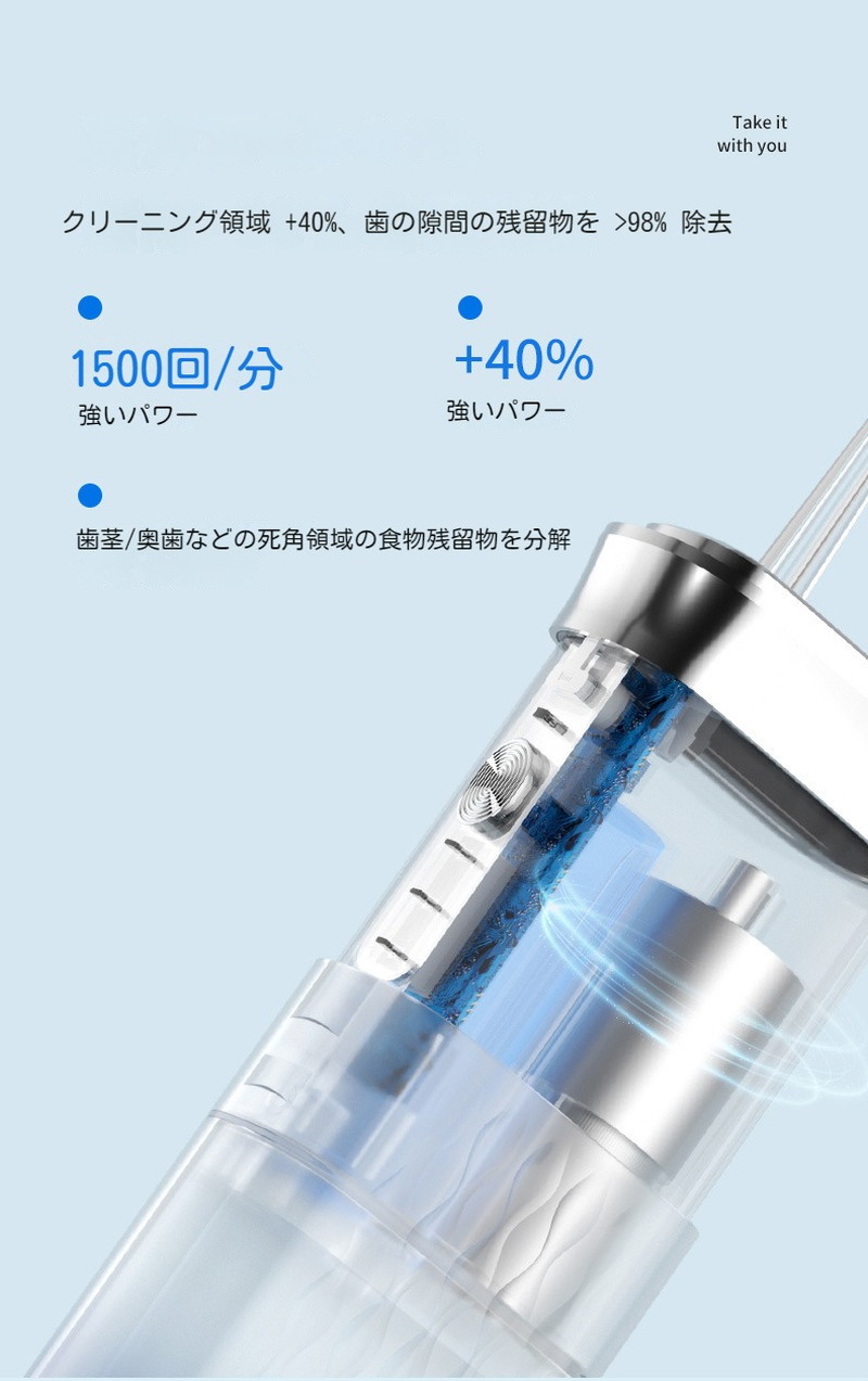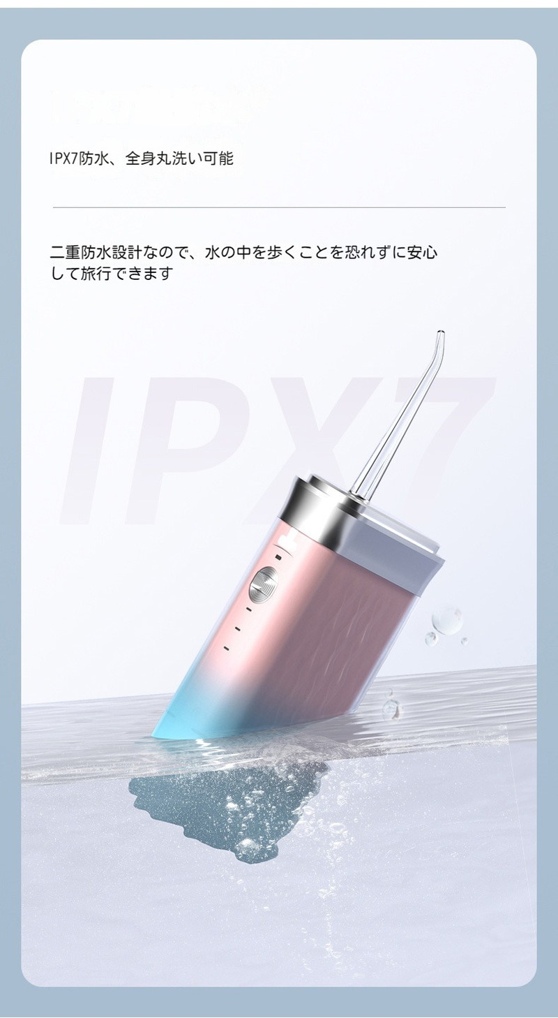 【ポータブル・使用に便利】携帯並びのサイズでポータブル、スペースをかからず持ち運ぶことができ、出張、旅行に最適!口腔洗浄器がIPX7防水レベルで、充電口にも防水カバーが付きですので、トイレなど水の多いところで楽に使用できます。