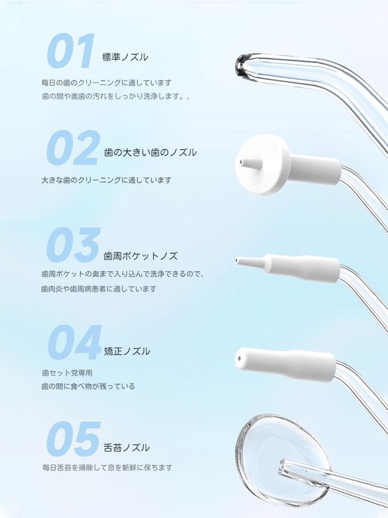 「様々な機能を備えた5つのノズル」セットには高圧ノズル、舌クリーナー、歯列矯正器用ノズル、歯周ポケット用ノズル、歯面ノズル合計5本ノズルが付属されています。