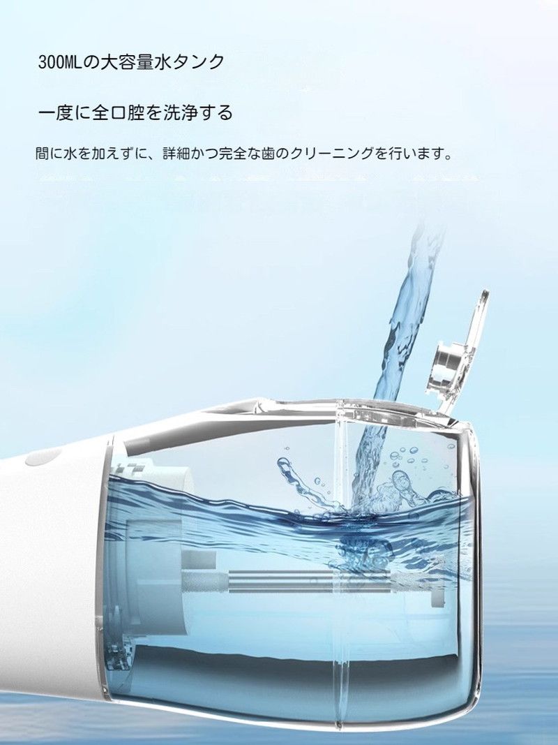 「350ml大容量タンク/水継ぎ足し不要」350mlの超大容量で洗浄途中で頻繁に水を補給する必要はありません。ノズル/チューブも分解して洗浄できて、楽々に衛生状態を保てます。半透明水タンクで、水量が一目でわかります。IPX6クラスの防水機能を搭載しシャワーでもお風呂でも使えます。(※長時間に水に浸さないでください)