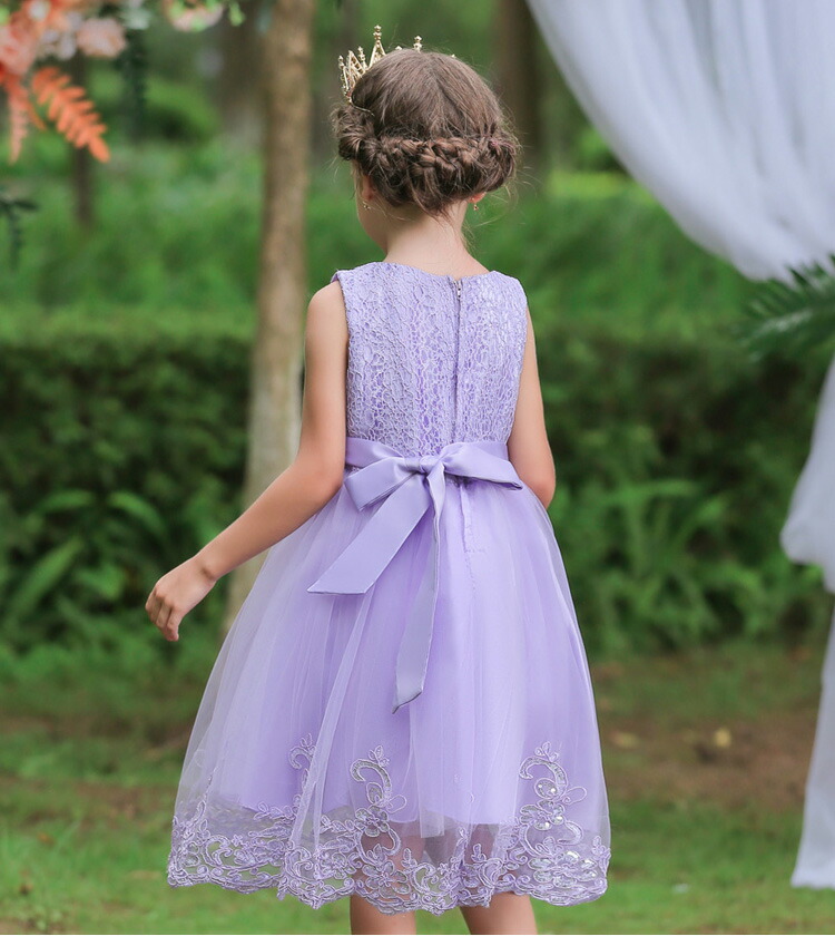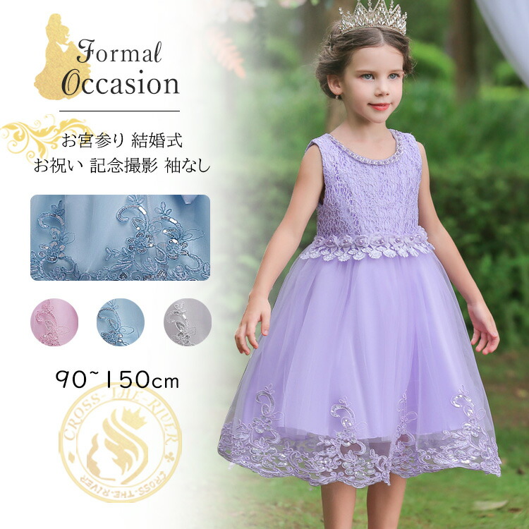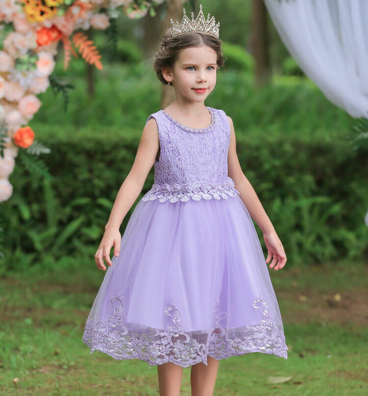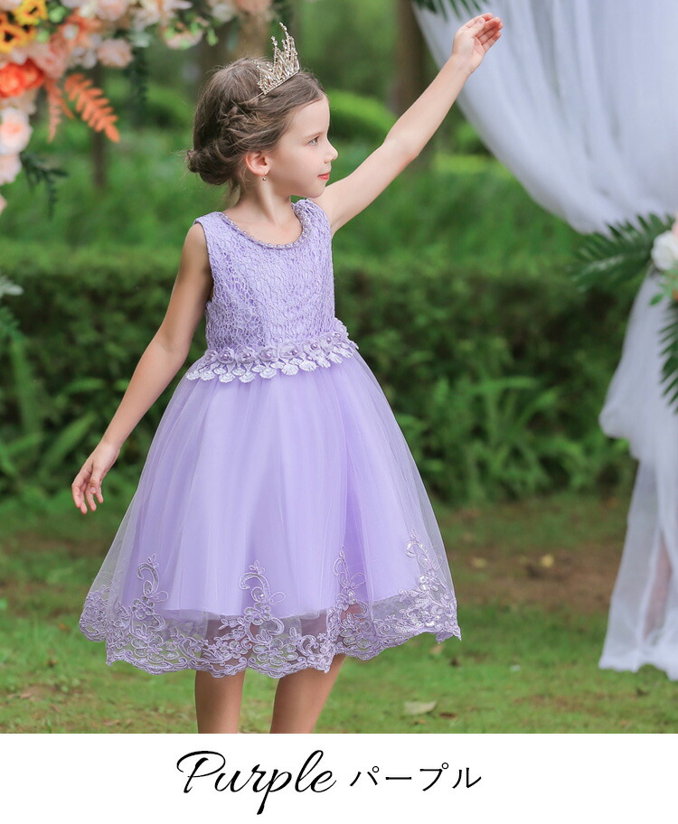 ドレス 子供 ピアノ発表会 中学生 結婚式 130 120 演奏会用ドレス 小学生 キッズ 女の子 刺繍 ロングドレス ワンピース ファスナー 紫 ピンク 花飾り 膝丈 半袖 コ レース